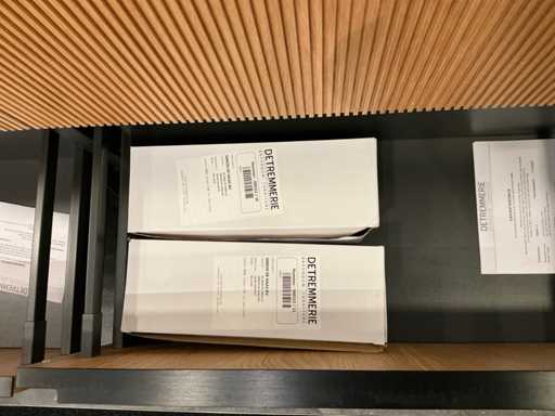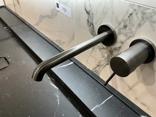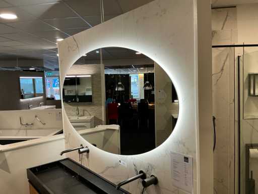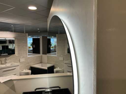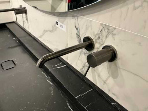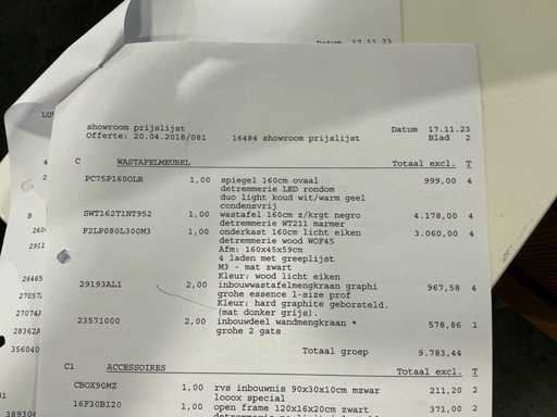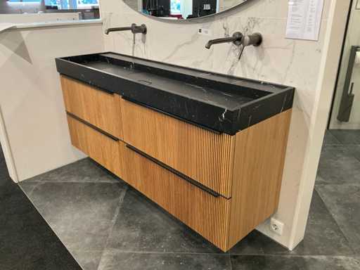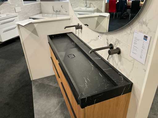 Consisting of a condensation-free LED mirror 160cm oval, 160cm duo sink (WT211 marble), Light oak base cabinet (160x45x59cm) with 4 drawers, 2x built-in part of Grohe built-in wash faucet without built-in part.