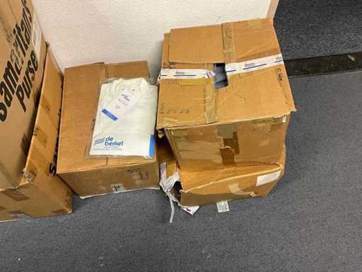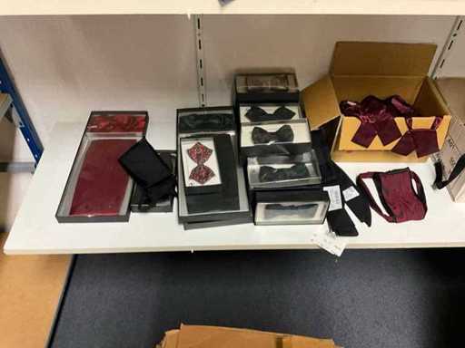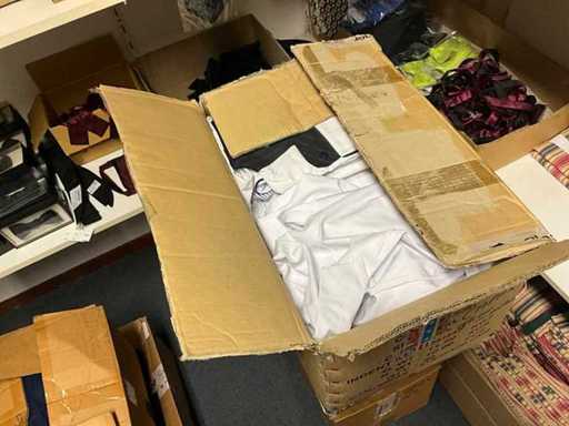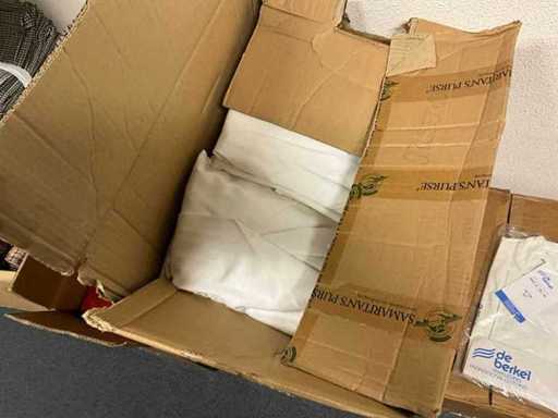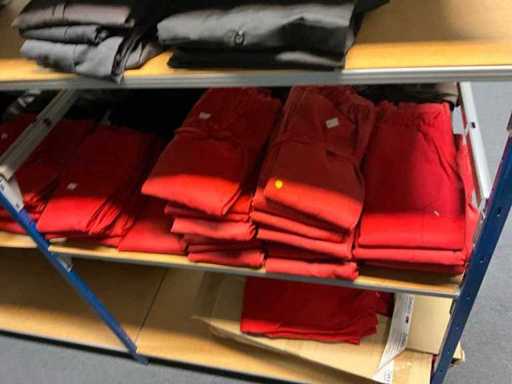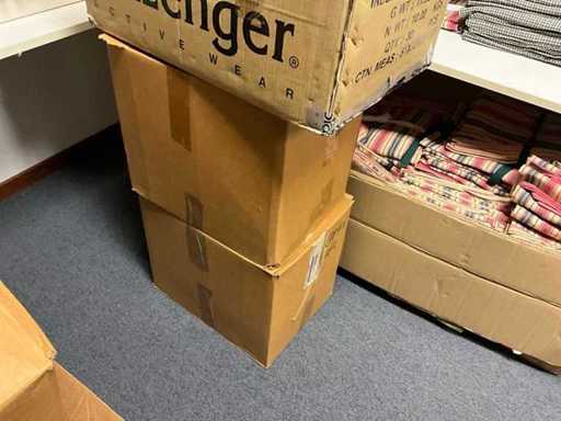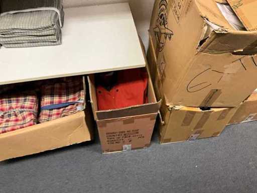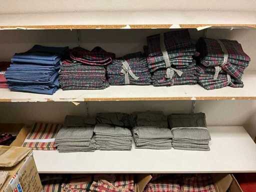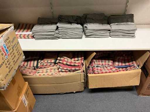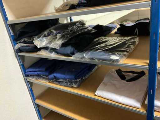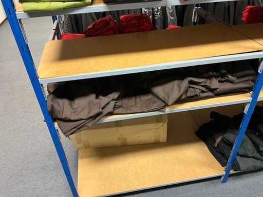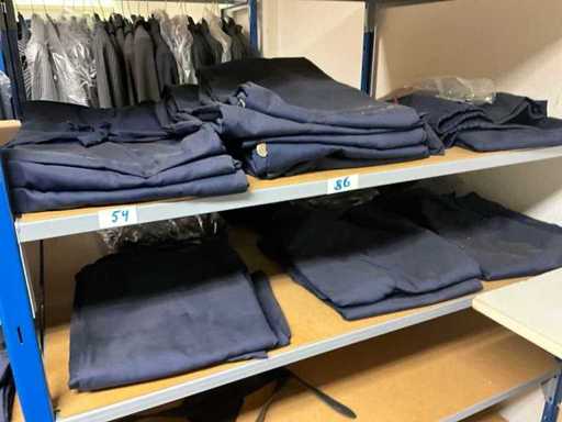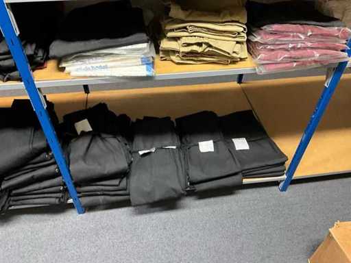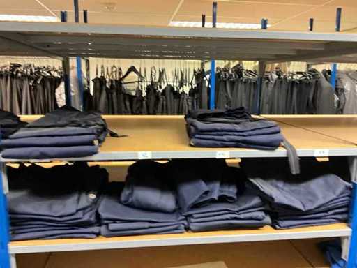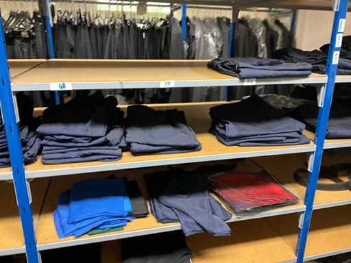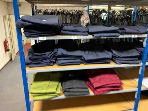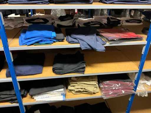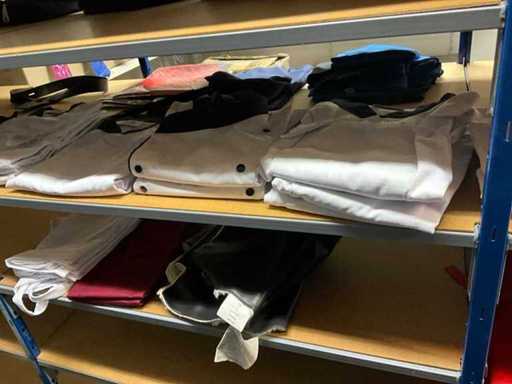 Consisting of approximately: 65x baker's trousers, 36x chef's jacket, 20x hilton, 110x food jacket, 336x work trousers, 275x apron and 150x tie/bow. Some other brands, various sizes and colors, excluding racks