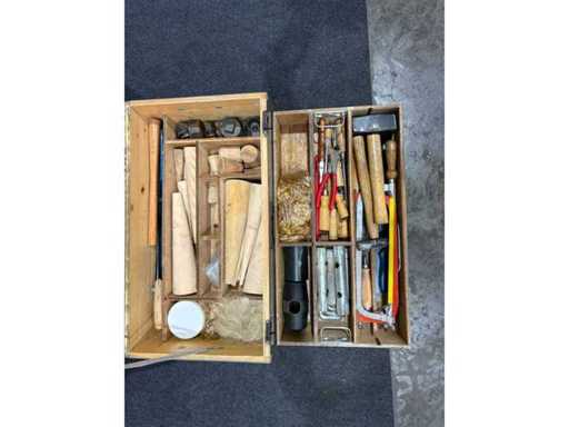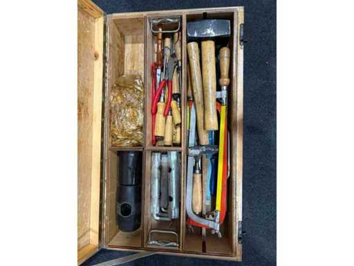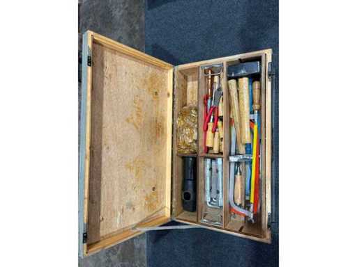 Solid hand tool set in a sturdy wooden/metal box. Fully equipped with various DIN-compliant hand tools, suitable for rescue, construction or technical services. Tools show signs of use, but according to the customer, they are complete and functional. Ideal for workshops, emergency vehicles or training facilities.
