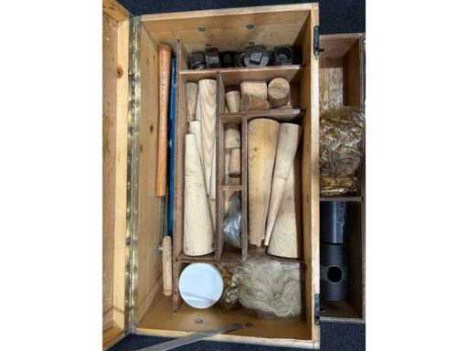 Toolbox contains, among other things, hammers, saws, files, pliers, screwdrivers, wooden dowels, darning material, spare parts – fully equipped.