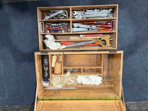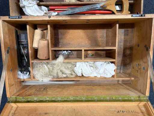 Toolbox contains, among other things, hammers, saws, files, pliers, screwdrivers, wooden dowels, darning material, spare parts – fully equipped.