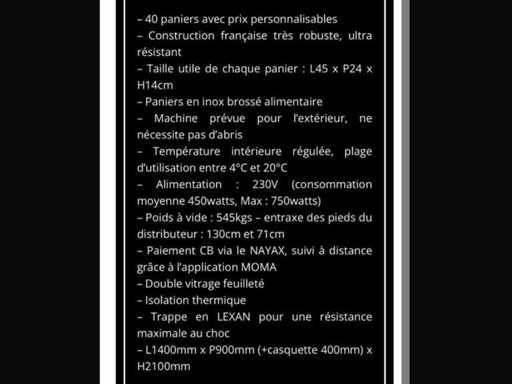 Refrigerated vending machine. Excellent working condition almost unused! Full interview carried out on 26/02 by the company The distrib. Sales capacity of 40 items. dimension of each locker: 44cm/24cm/15cm payment by credit card via NAYAX, remote monitoring thanks to the MOMA application. Remote stock tracking!