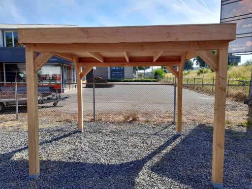 Consisting of: Douglas finely sawn posts 120x120 cm, beams 120x120 cm, beams 5x15cm. Roof boards: 18mm, roofing: roofing felt. Passage height: 215cm. Equipped with mounting material and manual.