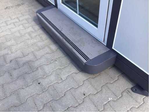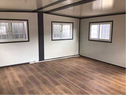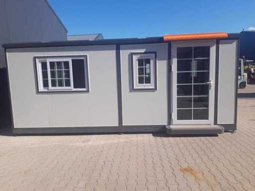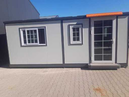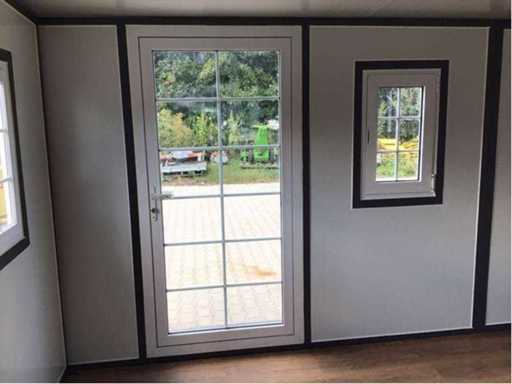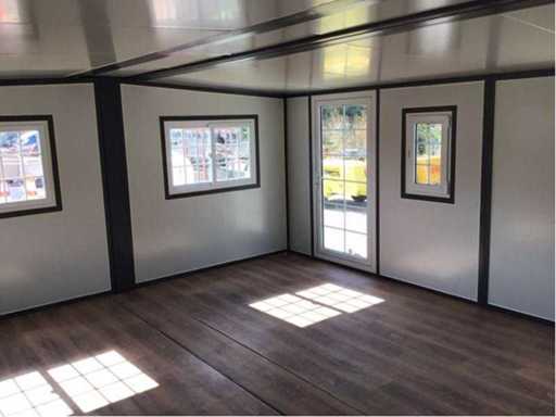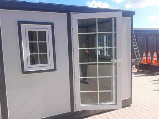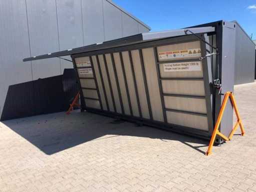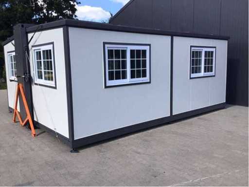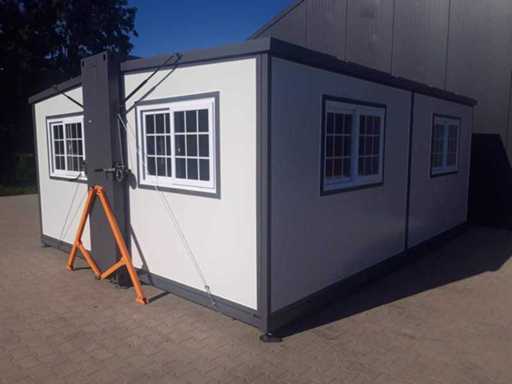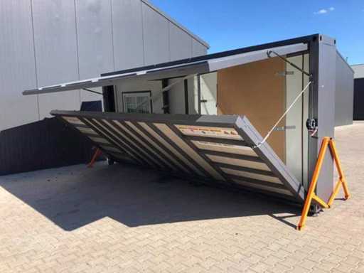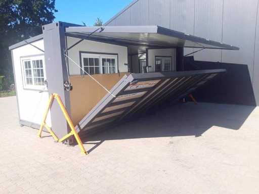 Insulated fold-out walls and roof (15 ft x 20 ft) lockable with key and knob cylinder; plastic frames with double glazing; drainage channel; plateau; transport dimensions 5890x720x2550 mm (lxwxh); For more info, see downloads (type 0207); (this lot fits in the 40 ft LYPU container); © unused.