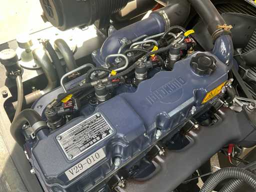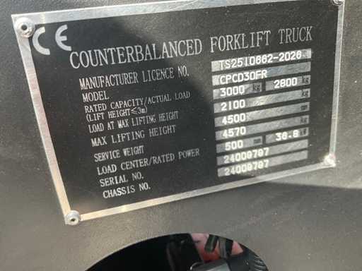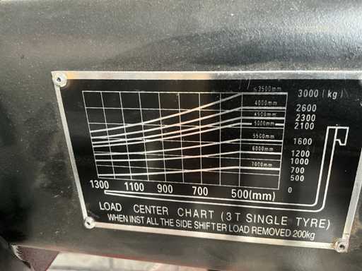 Lifting capacity 3.0 tons; 3-stage 4.5 m mast, sideshift; Hydraulic transmission (automatic), 1.22 m fork length; engine 36.8 kW, pneumatic tires; Maintenance-free battery; Seat with seat belt and safety bar. Warning light.