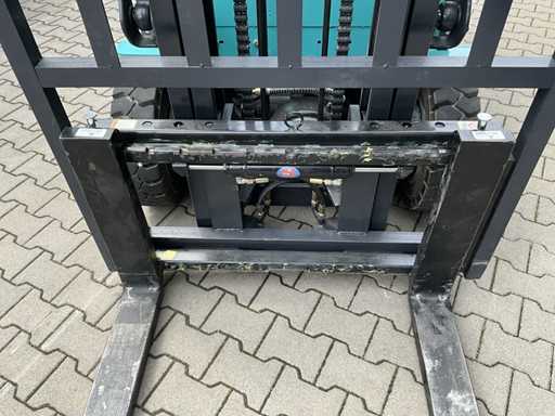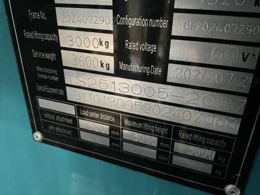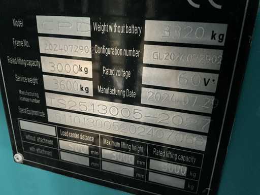 Model: CPD-30; nominal capacity: 3000 kg; load center distance: 500 mm; Tyre type: solid tyre; Number of wheels (front/rear): 2/2; Band (front): 23*9-10; Band (REOR): 18*7-8; SIZE: mast tilt, fore/aft: 6/12°; Height, mast retraction: 2200 mm total maximum lifting height: 3000 mm; height, most elongated: 4200 mm; Truck body length (excluding fork): 2600 mm; Truck width: 1200 mm; turning radius: 2800 mm; ground clearance under mast: 100; Speed, loaded/unloaded: 10/10 km/h Lifting speed, loaded/unloaded: 200/300 mm/s; speed reduction, loaded/unloaded; 450 mm/s; service brake: hydraulic/mechanical; ; equipped with sideshift; unused; The forklift can be loaded via a loading ramp. incl. inspection sticker; 2 pieces of brake lights; Indicators; rear-view mirror; horn; reversing signal; work lighting; safety belt; armrests; emergency stop