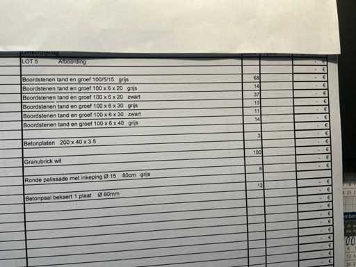 Curbs tongue and groove 100/5/15 grey 68 pcs., 100x6x20 grey 14 pcs., 100x6x20 black 37 pcs., 100x6x30 grey 13 pcs., 100x6x30 black 11 pcs., 100x6x 40 grey 14 pcs., concrete slabs 200x40x3.5 3 pcs. Granubrick white 100 pcs., round palisade with notch diam. 15 80cm high grey 8 pcs., concrete slab Bekaert 1 slab diam. 60 mm 12 pcs.