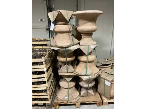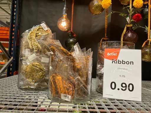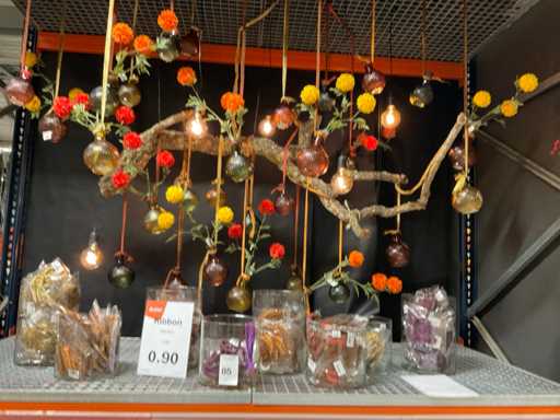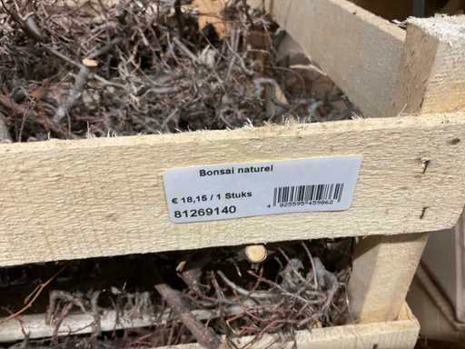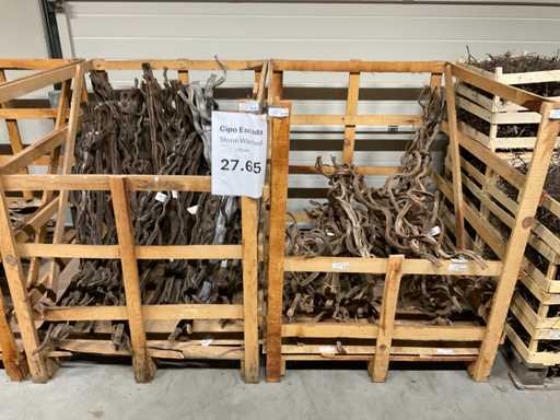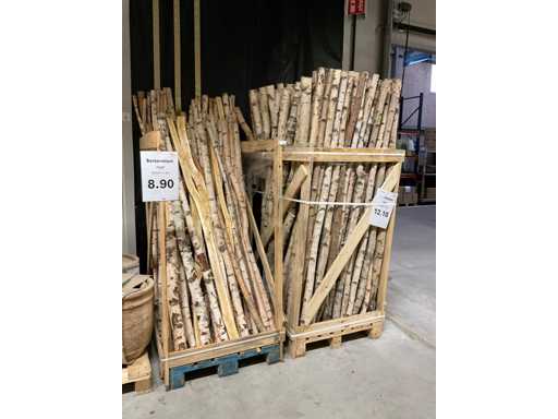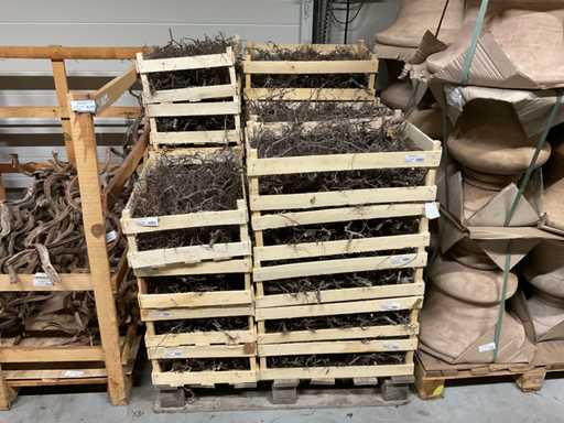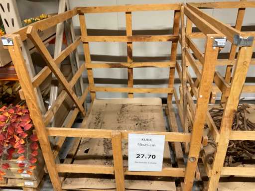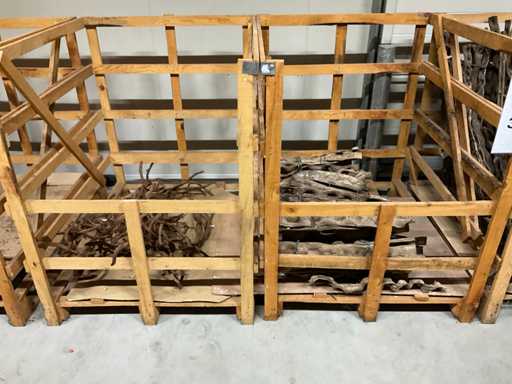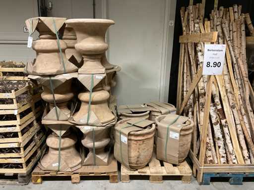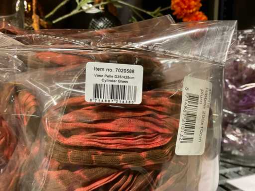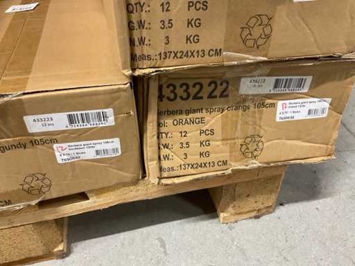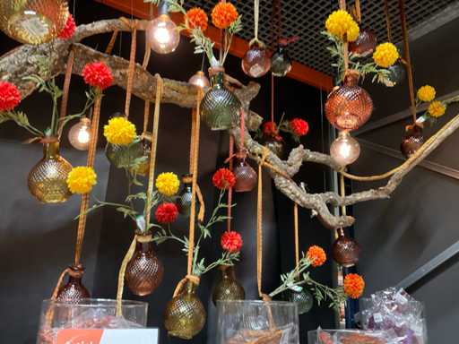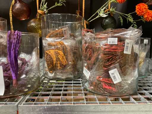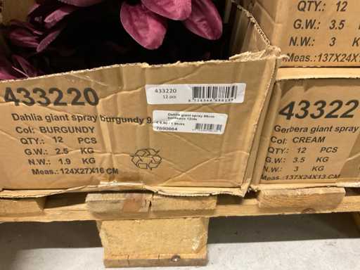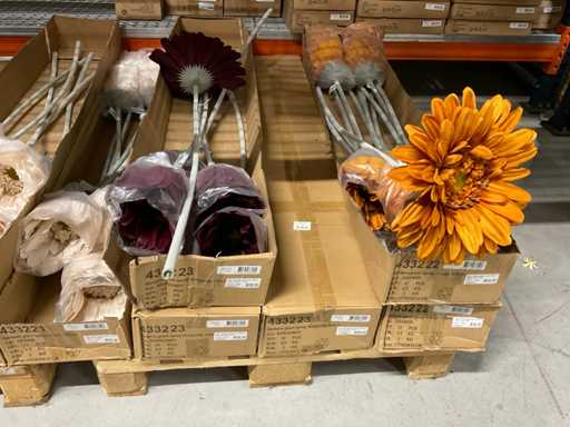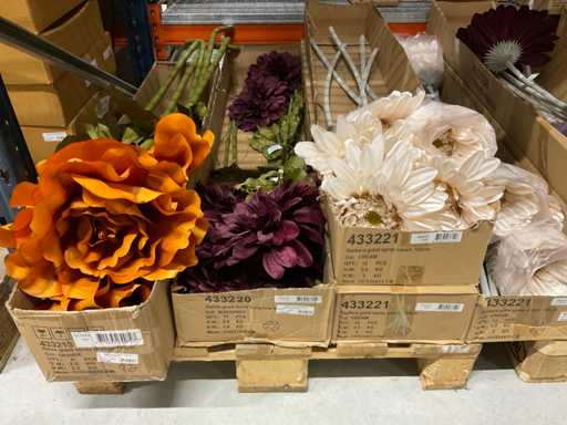 Contents section pallet rack with decorative branches, flower vases, artificial flowers, glass vases and fabric ribbon