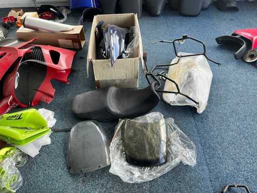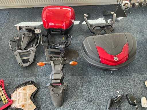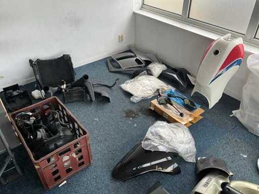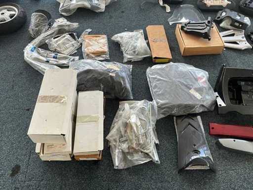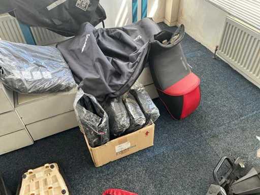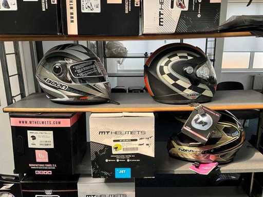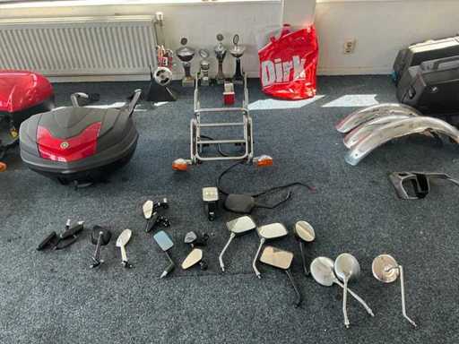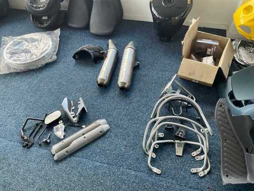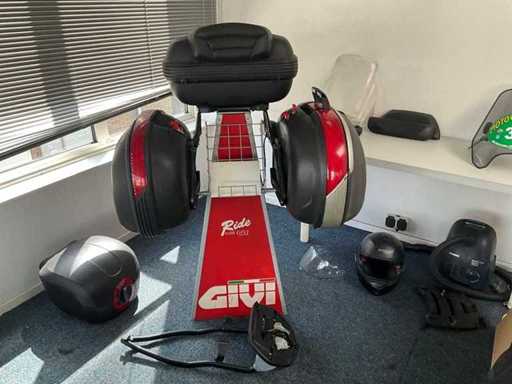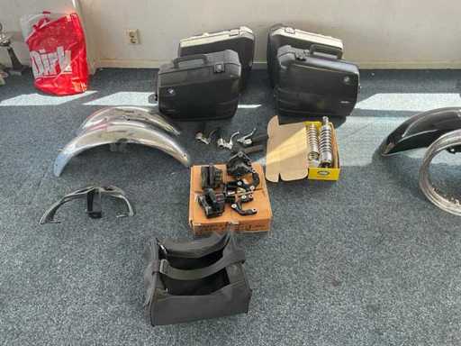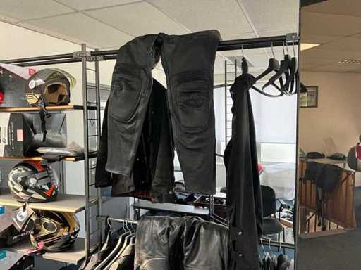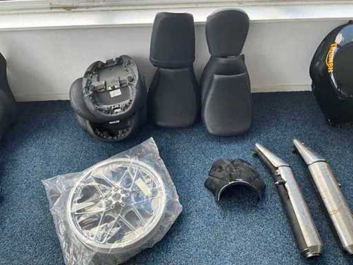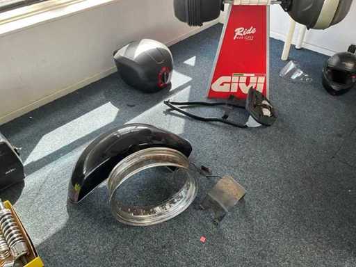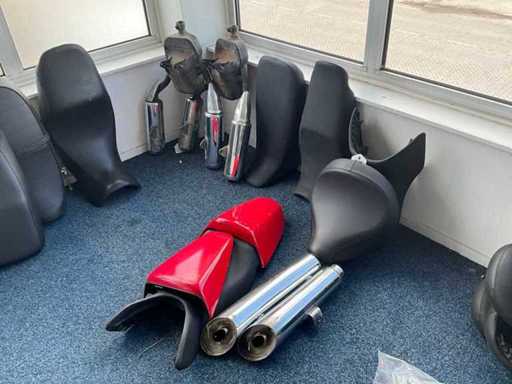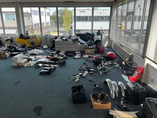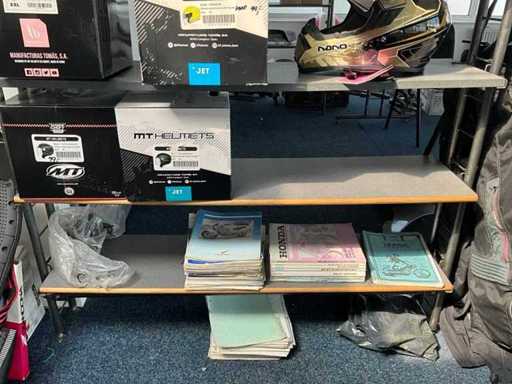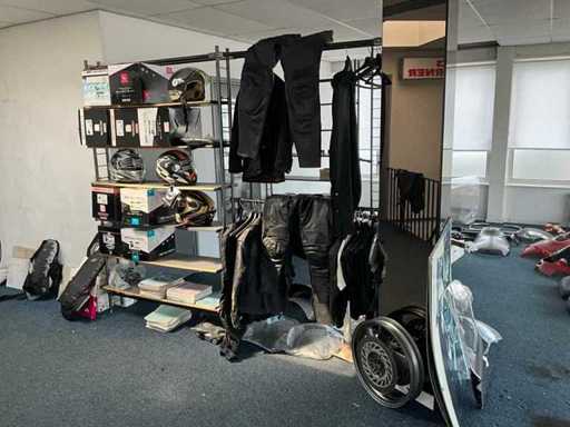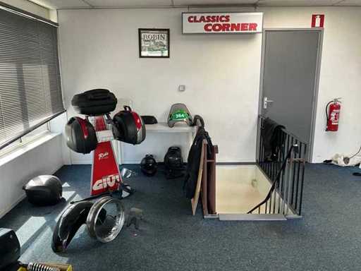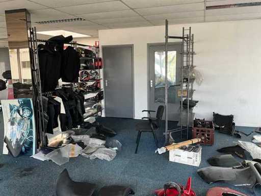 Concerns the content of the floor; consisting of, among other things: motorcycle seats, hoods, exhausts / collectors, mirrors, suitcases, Triumph fuel tank, motorcycle clothing, MT Helmets motorcycle helmets (urban design, FU401SV ATOM SV, Le Mans 2 SV, Avenue SV), wall decoration, racks