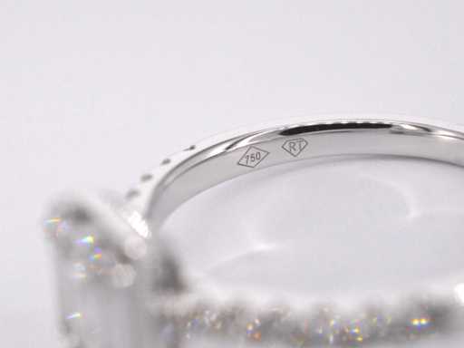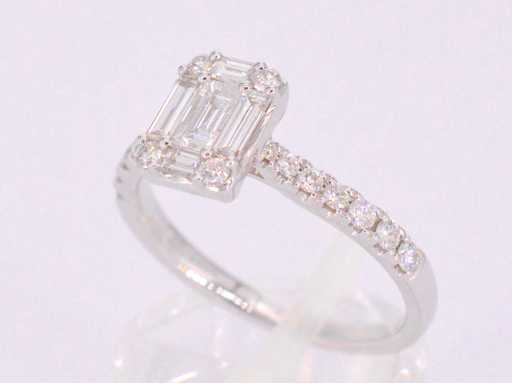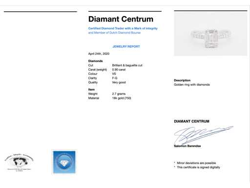 Diamond: Natural; Cut: Brilliant and baguette cut; Weight (carat): 0.90 carat; Color: F-G; Purity: USA; Cut quality: Very nice; Jewel: Ring; Weight: 2.7 ounces; Ring size (custom made*): 53 (17 mm); Material: 18K gold (750); Condition: New; Packing: Luxury jewelry box; Explanation: The quality has been taken from the report belonging to the item. The valuation is an assessment of a certified diamond dealer, based on consumer prices; Consumer price: € 7,403