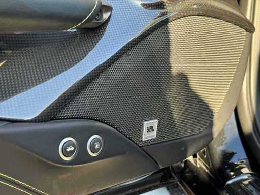 The interior is fully finished with carbon bucket seats, carbon center console, steering wheel, dashboard inserts and door panels. There are also dimming interior and exterior mirrors and the counter panel for the passenger. All equipment is factory options.