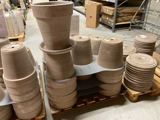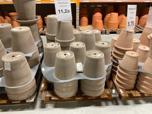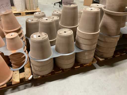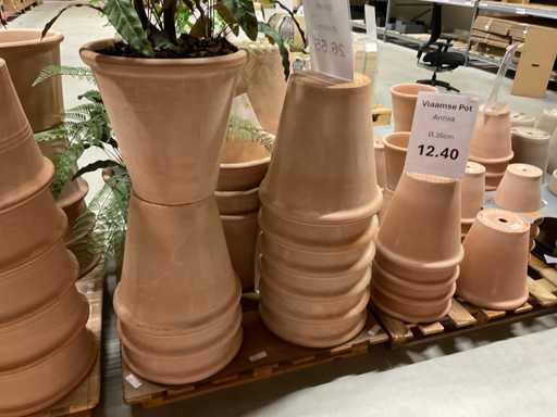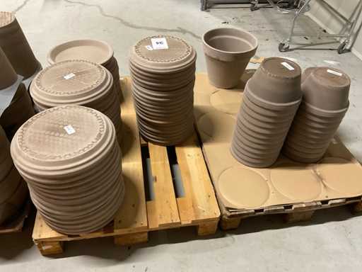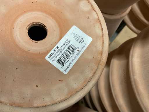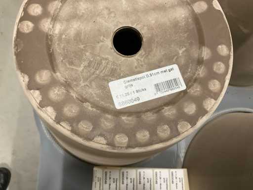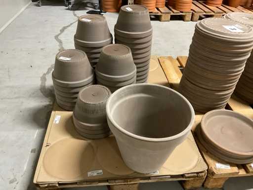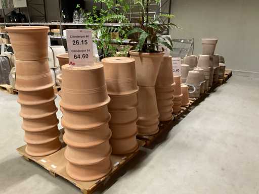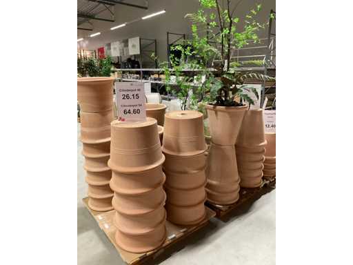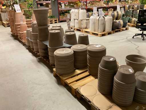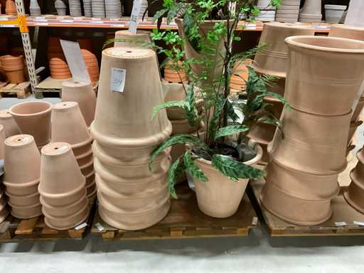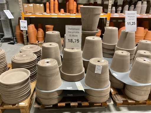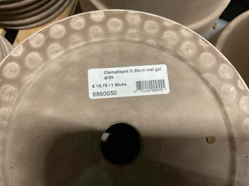 Clematis pots, cylinder pots and Flemish pots in various sizes including 31 cm, 36 cm, 45 cm as well as saucers and some artificial branches