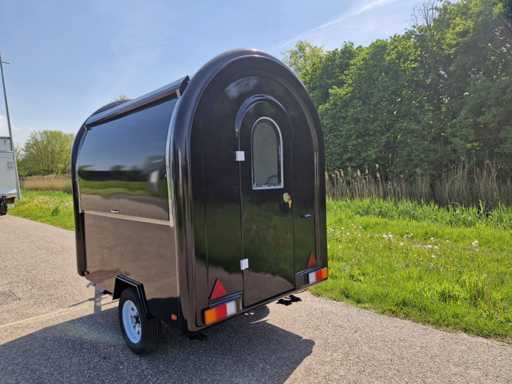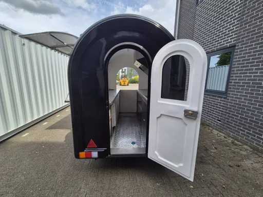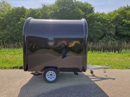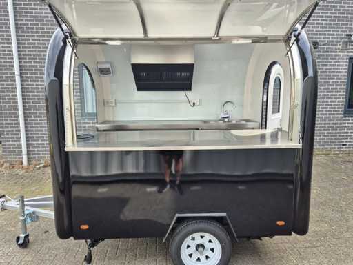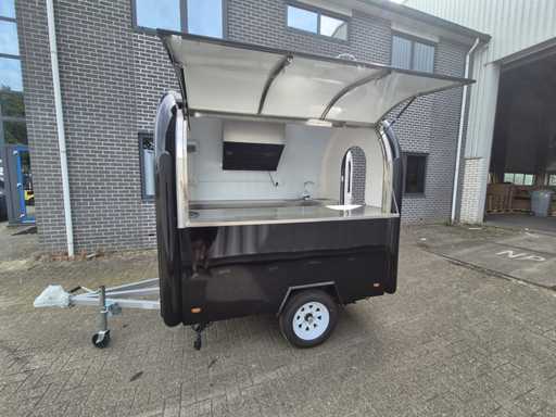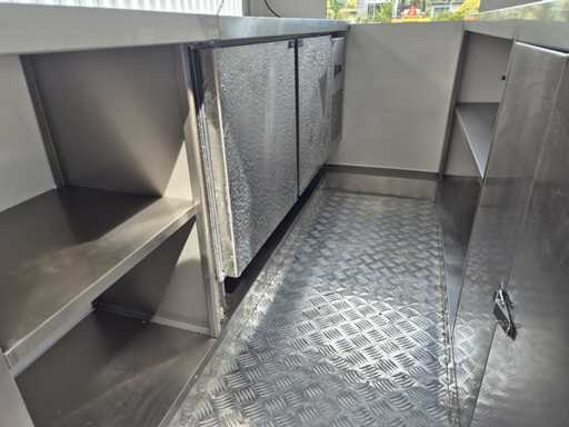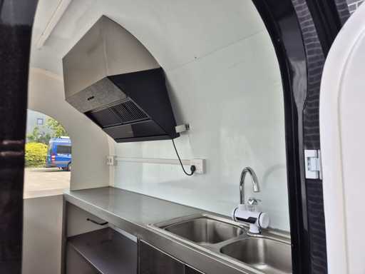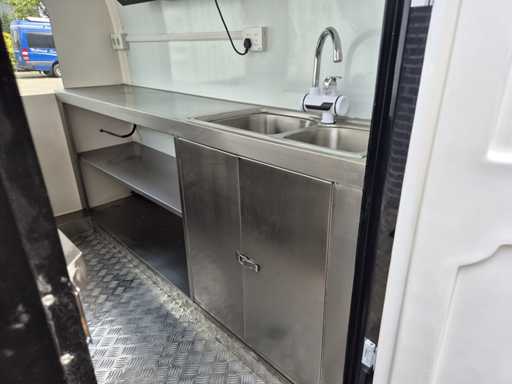 Black food truck with LED lighting, stainless steel built-in kitchen / workbench, group cabinet, refrigerated workbench, extractor hood, stabilizing legs.