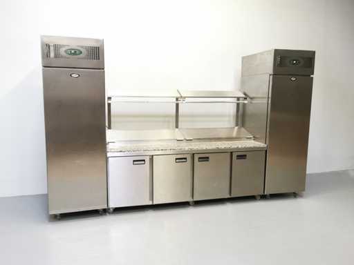 Combination Fridge, Freezer and Refrigerated Table equipped with stainless steel trays, marble worktop, top shelf and top storage area.Fridge and Freezer are EXTRA TALL 228CM! WITH VERY LARGE CAPACITY.
