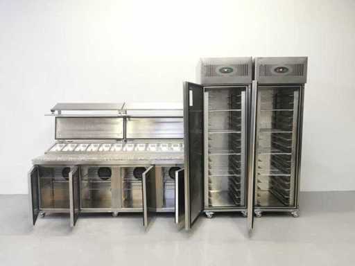 Combination Fridge, Freezer and Refrigerated Table equipped with stainless steel trays, marble worktop, top shelf and top storage area.Fridge and Freezer are EXTRA TALL 228CM! WITH VERY LARGE CAPACITY.