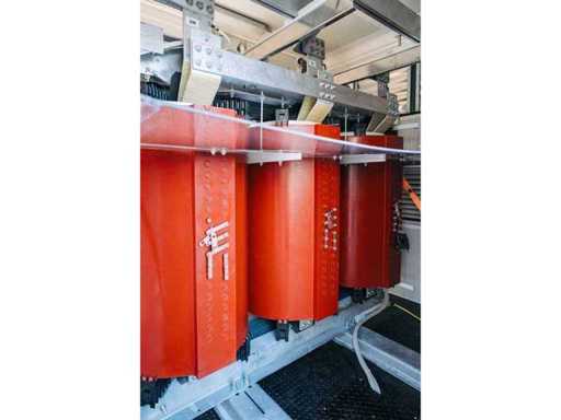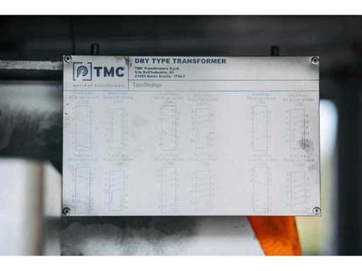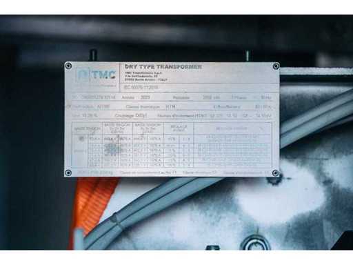 TMC 2889 kVA dry type high voltage power transformer, Graetz bridges, three-phase 50 Hz IEC 60076-11:2018 standard, input voltage 20,000 V, Dd0y1 coupling, LV voltage 330 to 445 V adjustable, air/glycol water cooling, environmental class E4/C3/F1, weight 6200 kg. Transmission by cooled copper bars. Rembe EGV wind explosion door with ES signaling unit, forced ventilation and closed-circuit air/water cooler.