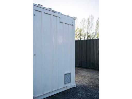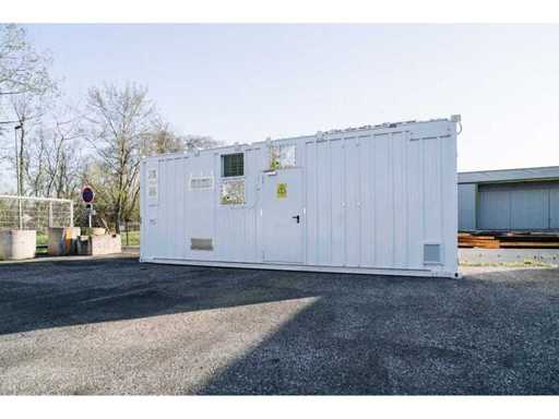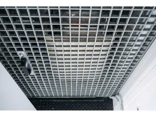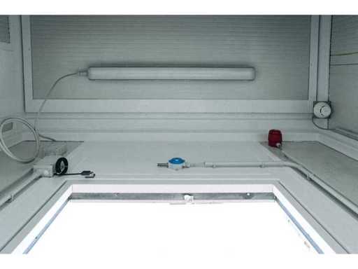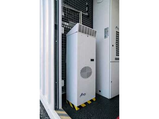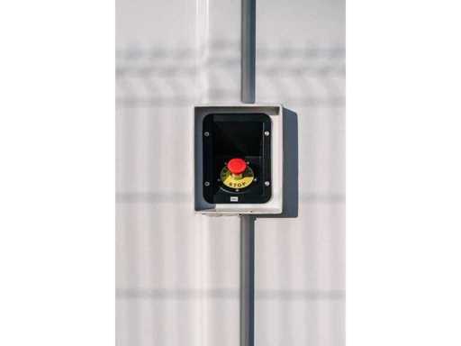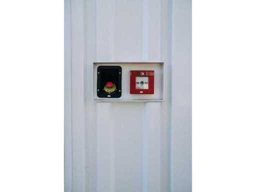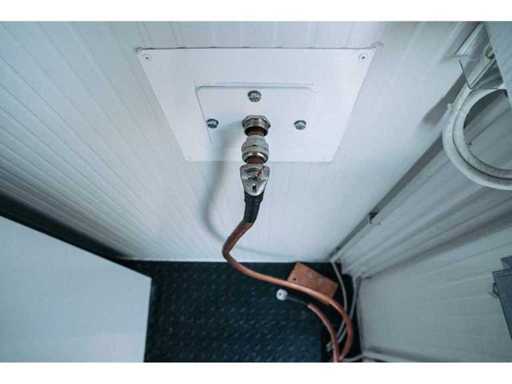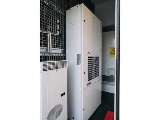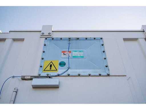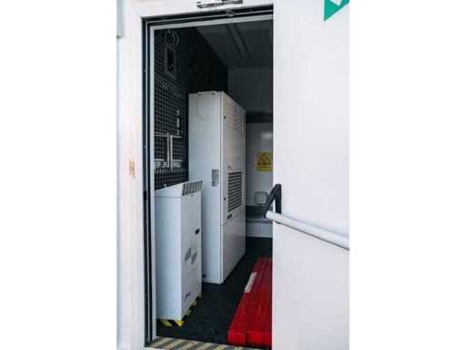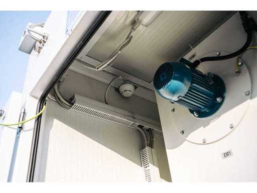 Transport dimensions L 8.50 m x W 2.55 m x H 3.25 m, weight 20,000 kg. 4 insulated parts with fire doors, fire and humidity alarm and detection system, removable roof to accommodate the cooling unit.