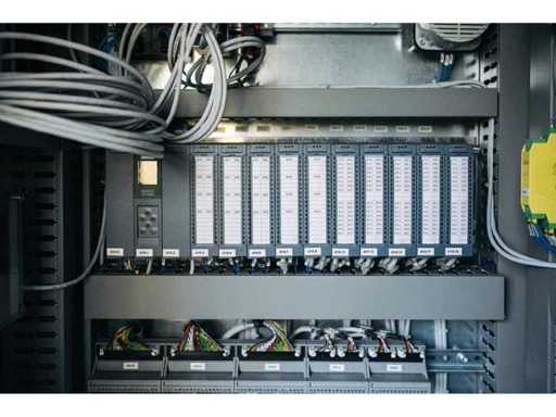 3-section electrical control cabinets including PLCs, Siemens/ABB control units, fire control panel, transformer protection, DRP 7.0 grinding modules.