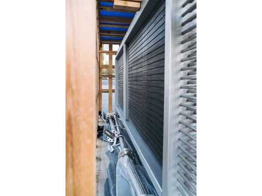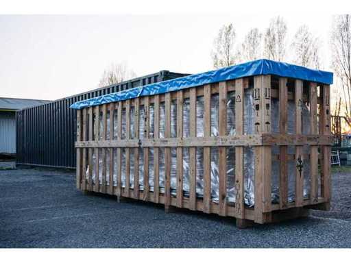 Dimensions L 445 x W 110 x H 158 cm, weight 750 kg including galvanised aluminium staircase and railing.