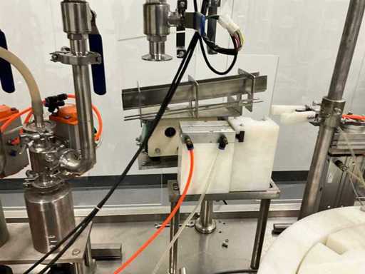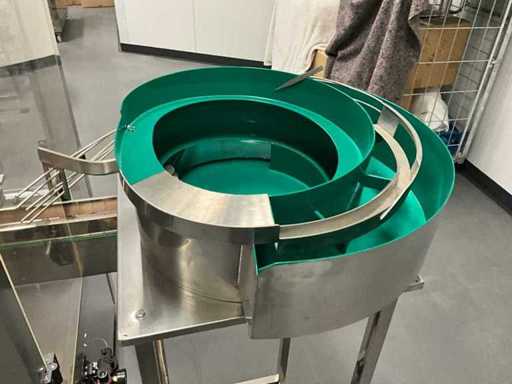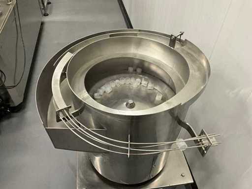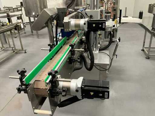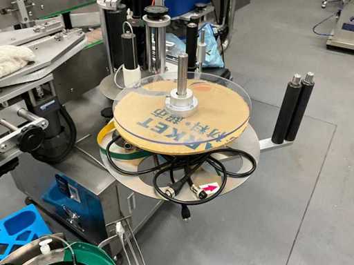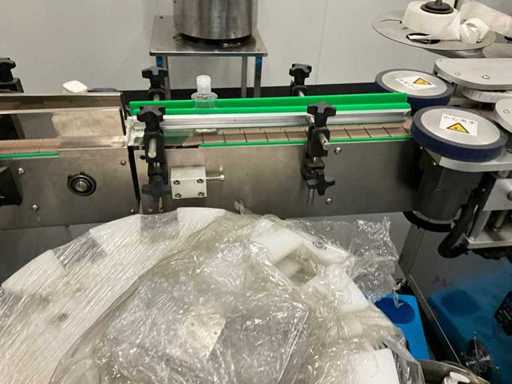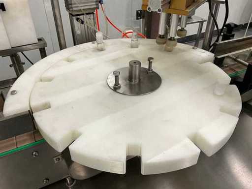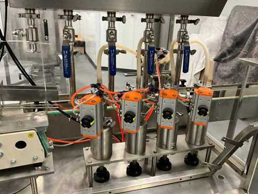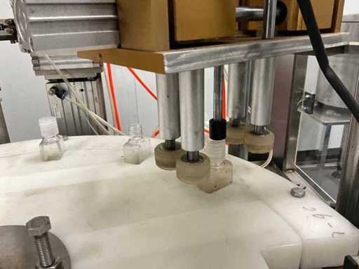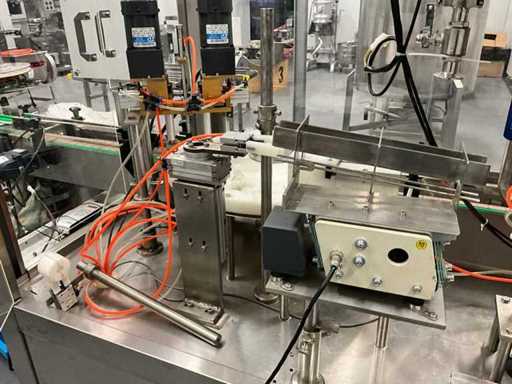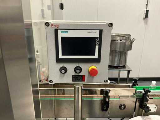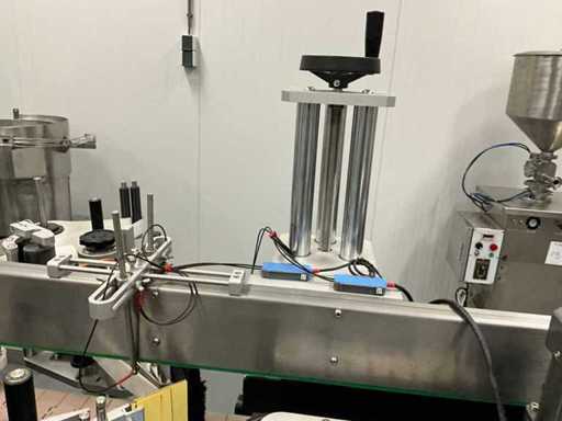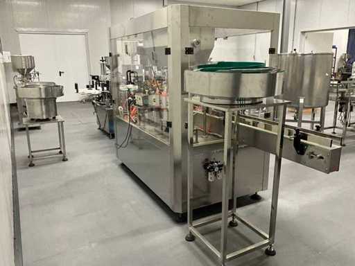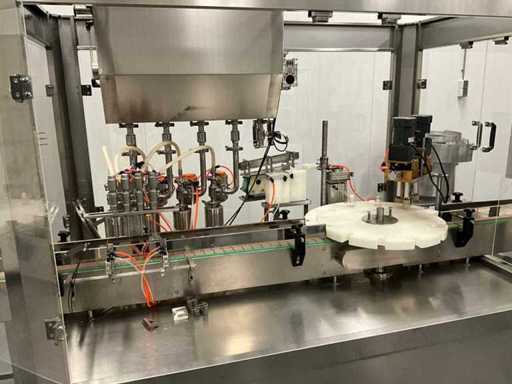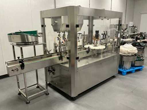 equipped with caps infeed, Automatic 4-head piston filling machine, Continuous link conveyor belt, Carousel Closing/positioning station, Outfeed conveyor, Complete safety casing (plexiglass), PLC control + HMI (Siemens / Weintek), Stainless steel housing, Automatic labeling machine, roll width adjustment, including various spare parts, carousel parts etc