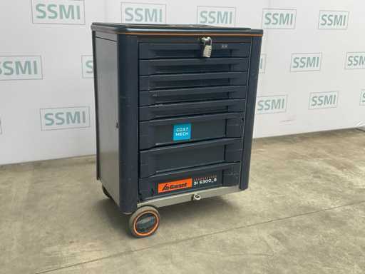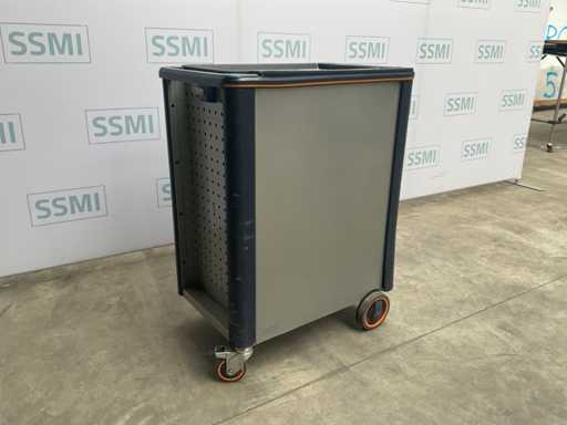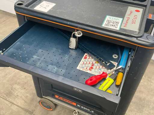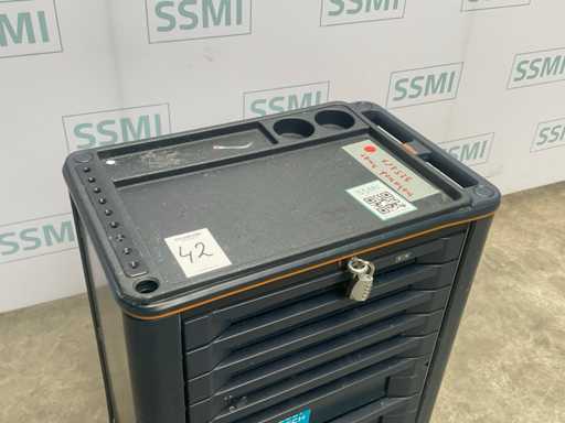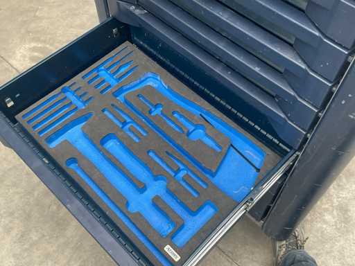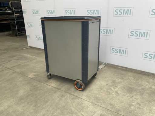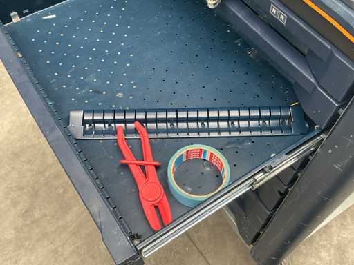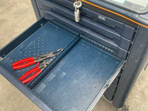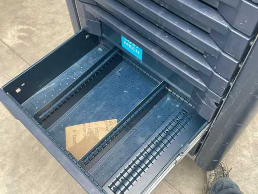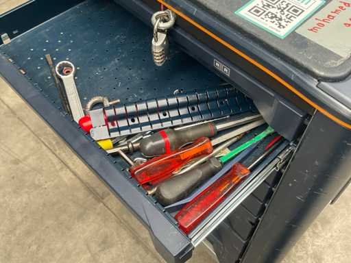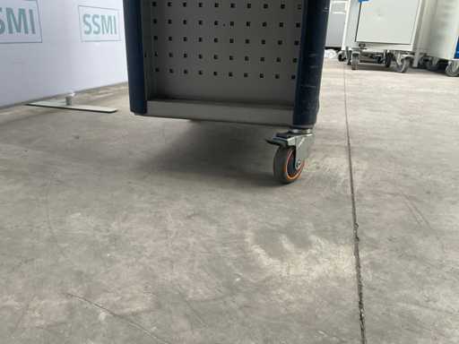 Equipped with 3 transport wheels, 2 of which are fixed, 1x swivel wheel; equipped with 8 drawers; including content; Missing 1 wheel
