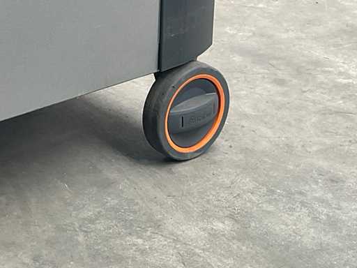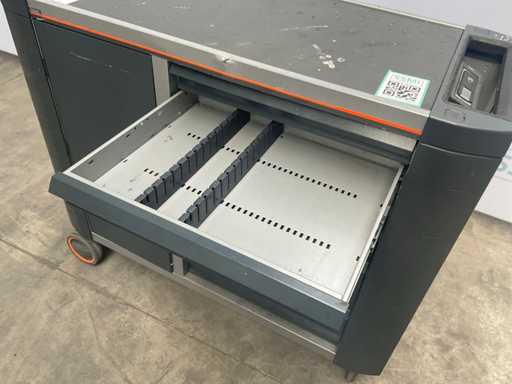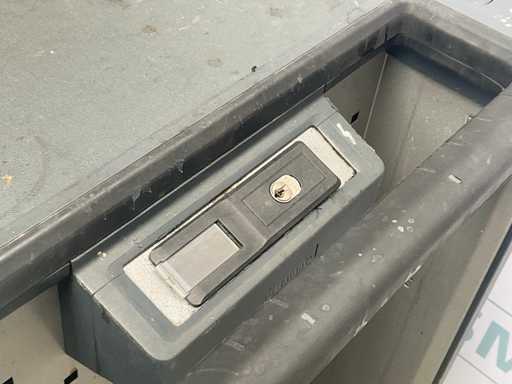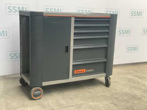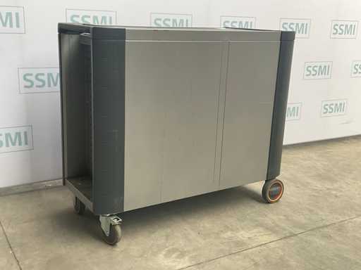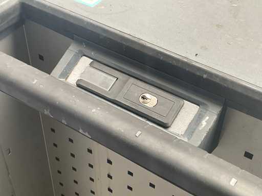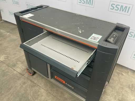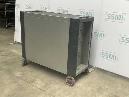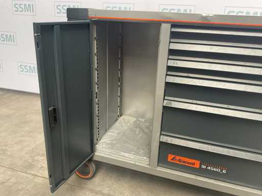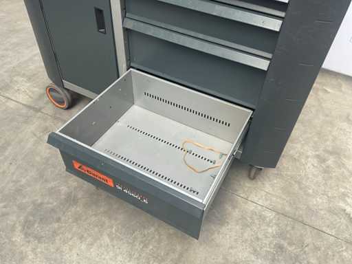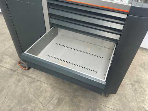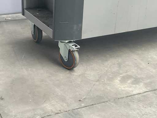 Equipped with 4 transport wheels, 2 with brake, 2x swivel wheel; equipped with 6 drawers; 1 door; empty