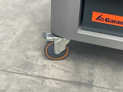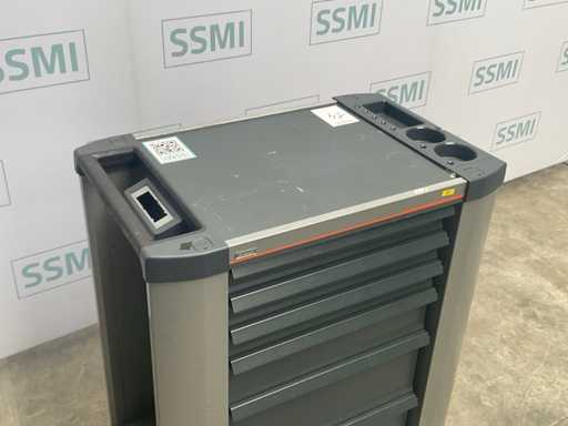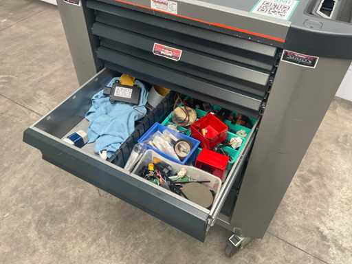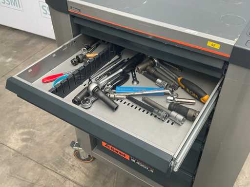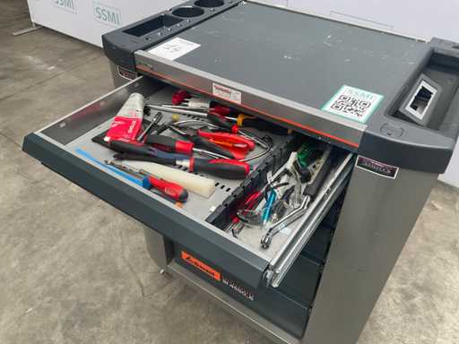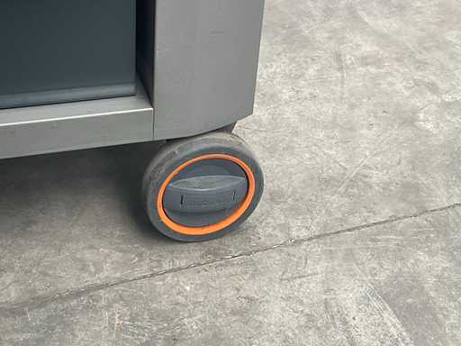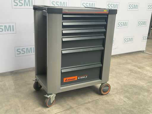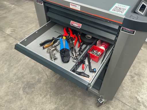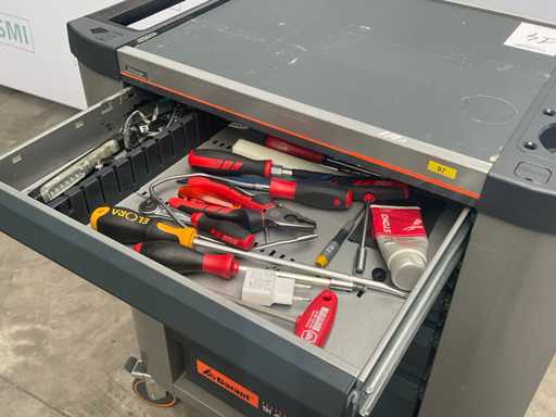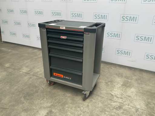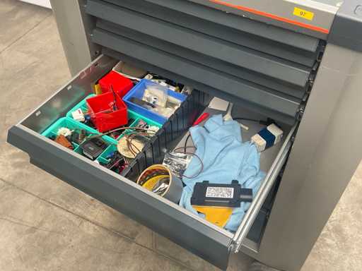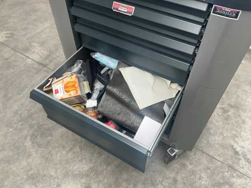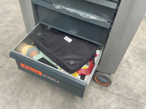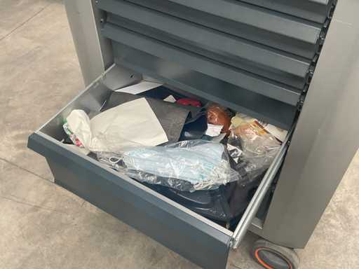Equipped with 4 transport wheels, 2 with brake, 2x swivel wheel; equipped with 6 drawers; 1 door; including content