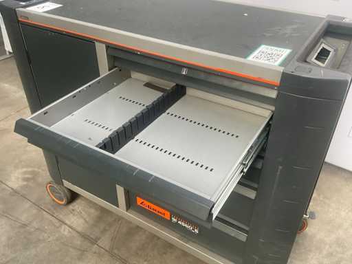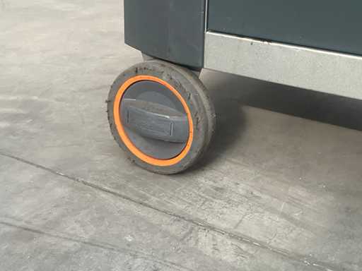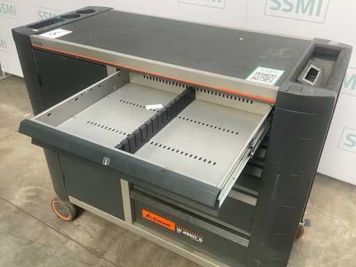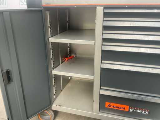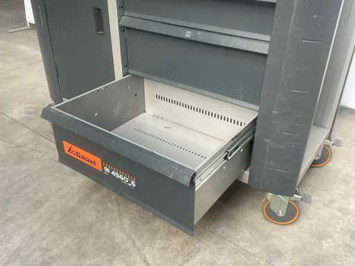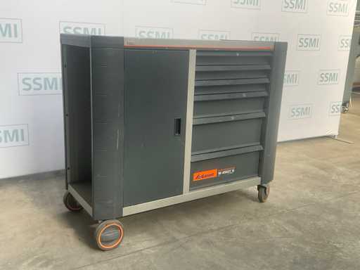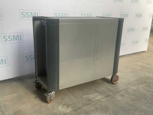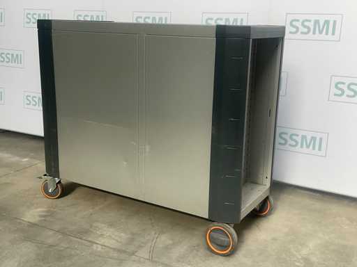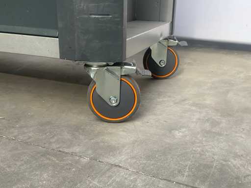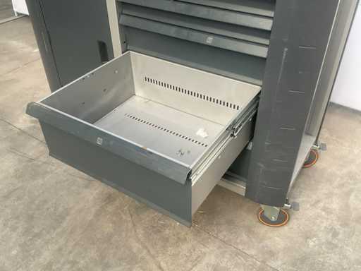 Equipped with 4 transport wheels, 2 with brake, 2x swivel wheel; equipped with 6 drawers; 1 door; empty