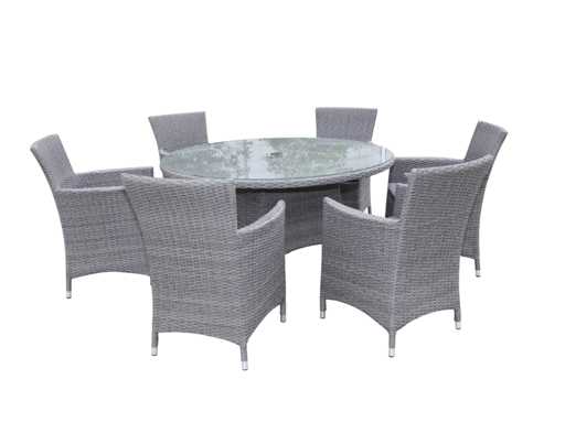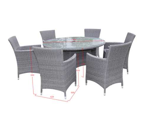 Type: LEON-1603. Model: 7-piece. Frame: Aluminum frame. Size: 7-piece set: 6 * chairs, 1 * round table with glass top: ø 140cm x 75 cm high.. Equipped with: Water-repellent cushions - weatherproof wickerwork - Powder-coated aluminum frame - Glass table top - Hole in table for parasol.