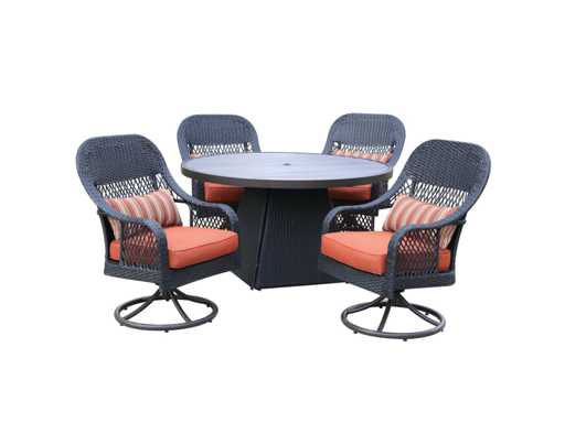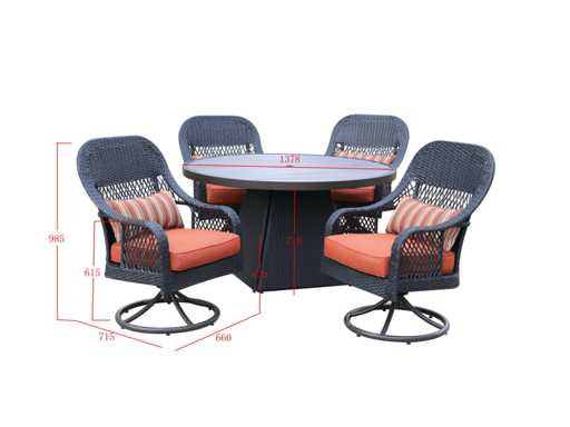 Type: REDONDA. Dimensions: 5-piece set: 4 * Loose swivel chairs: 66x71x98 cm, 1 * Round dining table: Ø138 cm, height: 71 cm. Seat height: 47 cm. Equipped with: Water-repellent cushions - Weatherproof wickerwork - Hole for parasol - Swivel chairs
