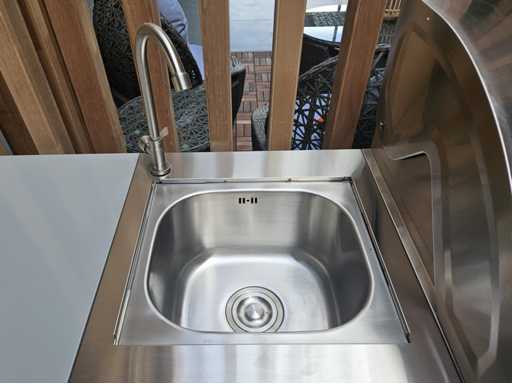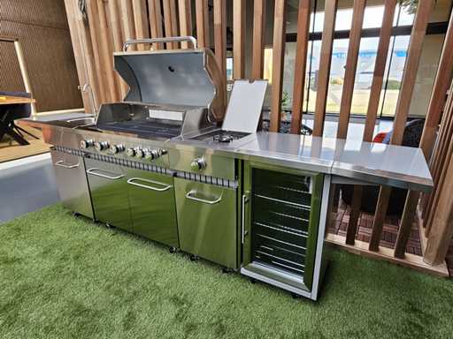 Type: JFK-005. Model: Stainless Steel Gas Barbecue – Complete outdoor kitchen. Color: Silver. Material: Stainless steel BBQ, Cast iron grate. Dimensions: W:308 x H118 x D:55 cm. 130 kg.. Grill surface: 90x48 cm. Equipped with: 6 Main burners and 1 extra gas burner - Rotisserie - Refrigerator - Sink with tap - Lighting - Cast iron grill - Cast iron hob - Warming rack - Electric ignition - Lid with thermometer - Wheels - Storage space in 4 cabinets.