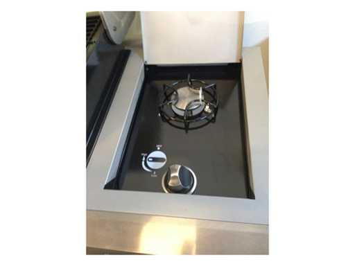 Type: JF005. Grill surface: 900x490mm. Equipped with: 5 Main burners and 1 side burner - Cast iron grid with warming rack and drip tray - Electric ignition - Storage space with doors - Shelf - Lid equipped with thermometer - Mobile.