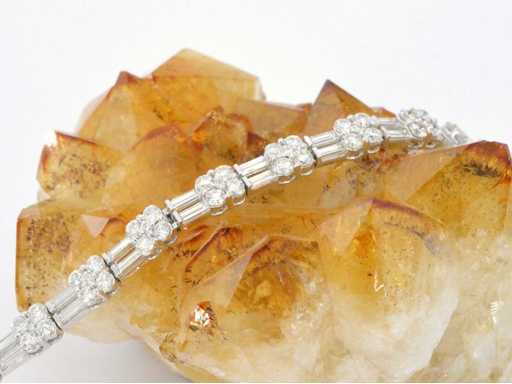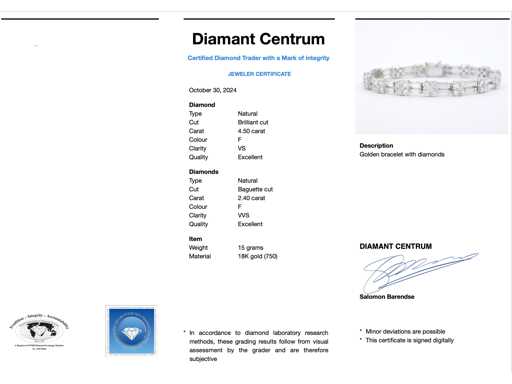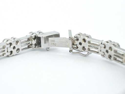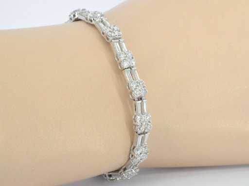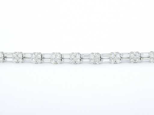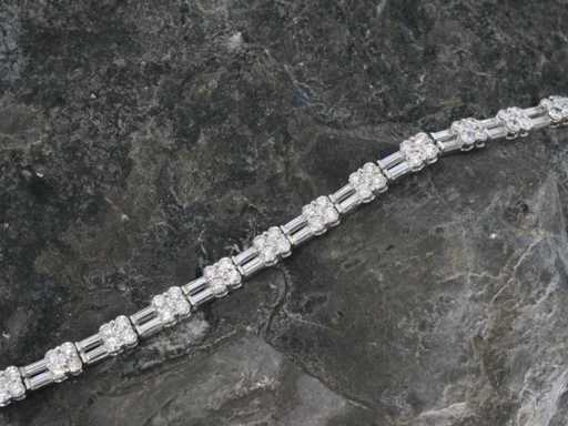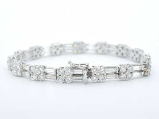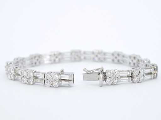 Diamond: Natural; Quantity: 75 pieces; Cut: Brilliant cut; Weight (carat): 4.50 carat; Color: F; Purity: USA; Cut: Excellent; Diamond (secondary): Natural; Number of diamonds: 30 pieces; Cut: Baguette cut; Weight (carat): 2.40 carat; Color: F; Purity: VVS; Cut: Excellent; Jewel: Bracelet; Weight: 15 grams; Dimensions/length: 15.5 cm; Material: 18K gold (750); Condition: As good as new; Packing: Luxury jewelry box; Explanation: The quality has been taken from the report belonging to the item. The valuation is an assessment of a certified diamond dealer, based on consumer prices; Consumer price: € 31,500