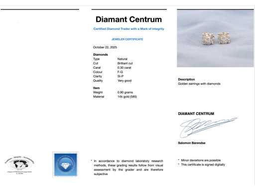 Diamond: Natural; Cut: Brilliant cut; Weight (carat): 0.30 carat; Color: F-G; Purity: SI-P; Cut quality: Very nice; Jewel: Earrings; Weight: 0.9 grams; Material: 14 carat (585); Condition: New; Packing: Luxury jewelry box; Explanation: The quality has been taken from the report belonging to the item. The valuation is an assessment of a certified diamond dealer, based on consumer prices; Consumer price: € 1,155