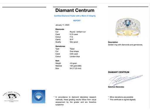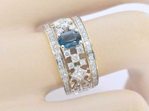 Diamond: Natural; Cut: Round and brilliant cut; Weight (carat): 0.75 carat; Color: F-G; Purity: SI-P; Cut quality: Very nice; Gemstone: Topaz; Cut: oval cut; Weight (carat): 0.65 carat; Colour: London blue; Jewel: Ring; Weight: 4.9 grams; Ring size (custom made*): 54 (17.25 mm); Material: 14 carat (585); Condition: New; Packing: Luxury jewelry box; Explanation: The quality has been taken from the report belonging to the item. The valuation is an assessment of a certified diamond dealer, based on consumer prices; Consumer price: € 3,693