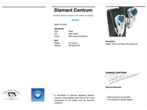 Gemstone: Topaz; Quantity: 2 pieces; Cut: Heart shape; Weight (carat): 4.00 carat; Colour: Swiss blue; Jewel: Earrings; Brand: Piaget; Model: Heart topaz; Weight: 21.3 ounces; Dimensions/length: 24 mm; Material: 18k gold (750); Condition: As good as new; Packing: Luxury jewelry box; Explanation: The quality has been taken from the report belonging to the item. The valuation is an assessment of a certified diamond dealer, based on consumer prices; Consumer price: € 20,000