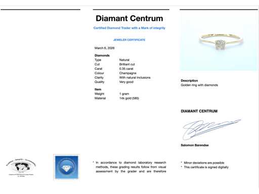Diamond: Natural; Quantity: 1 piece; Cut: Brilliant cut; Weight (carat): 0.35 carat; Color: Champagne; Purity: With natural inclusions; Cut quality: Very nice; Jewel: Earrings; Weight: 1 gram; Material: 14k gold (585); Condition: New; Packing: Luxury jewelry box; Explanation: The quality has been taken from the report belonging to the item. The valuation is an assessment of a certified diamond dealer, based on consumer prices; Consumer price: € 2,560