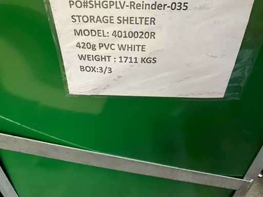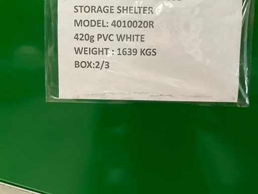 Equipped with 2 doors at the front and back (4 x 4 m), front also a wicket door, galvanized girth truss system, arch size 56 x 86 x 2 mm, purlin 48 x 1.5mm, thick PVC Tarpaulin in color white, doors equipped with hand winch, manual assembly, unused in metal crates, 3 collars of 300x80x150 cm, 4500kg