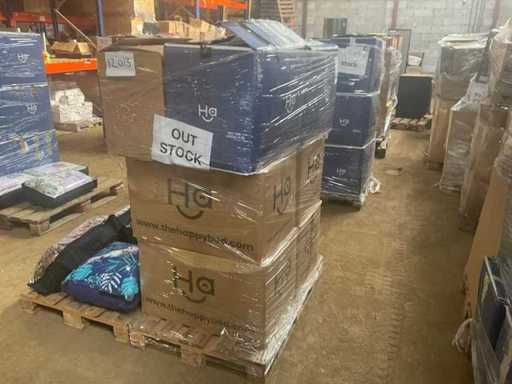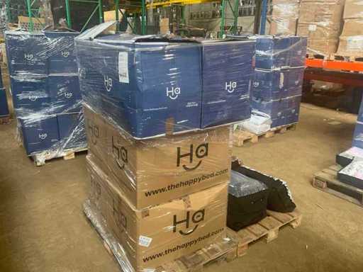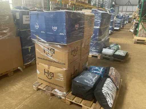 Pallet contain and mix of happybed items, The pallet can contain the following items; Sleeveless duvets, Pillows, Pillowcases, Fitted sheets & Toppers.