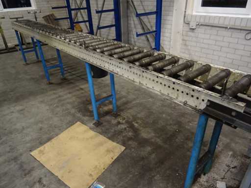 Equipped with feed roller conveyor 200x40cm (WxD) and discharge roller conveyor 450x40cm (WxD), machine dimensions: 146x52x140cm (hxwxd)
