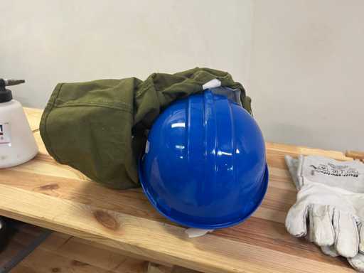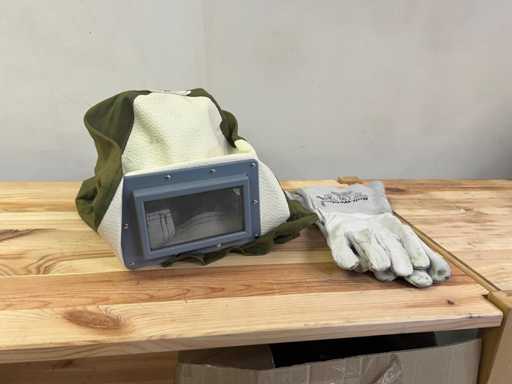 Complete blasting set consisting of HBM soda blasting gun with reservoir, protective cap with helmet and visor, pair of Bull Welder gloves and a bag of blasting media (sodium bicarbonate). The bag of abrasive has already been opened. Suitable for light surface treatment and cleaning with soda.