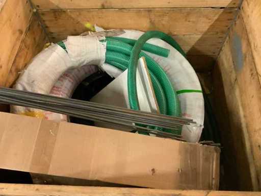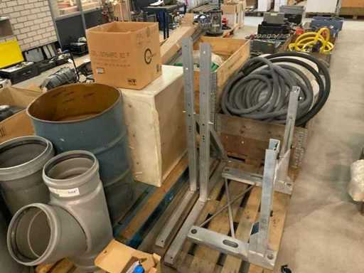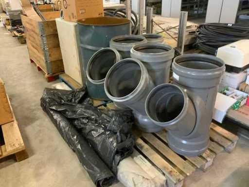 Including: flexible pipe jacket, 3 PVC y-pieces 315 x 250mm, 1 kitchen cabinet, 1 box with drains. On 5 pallets