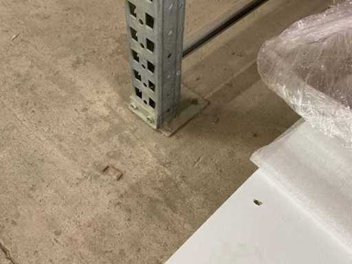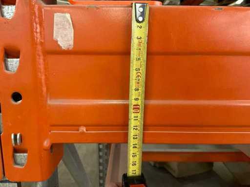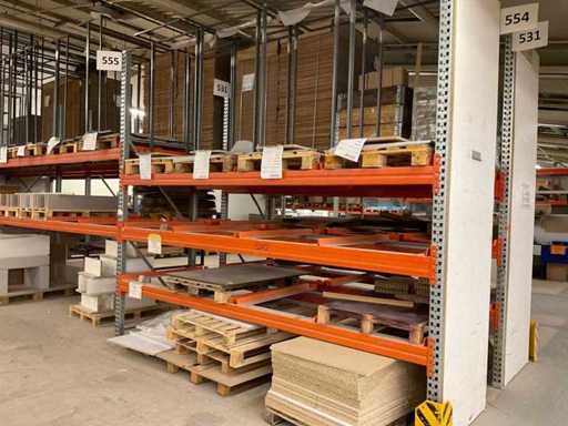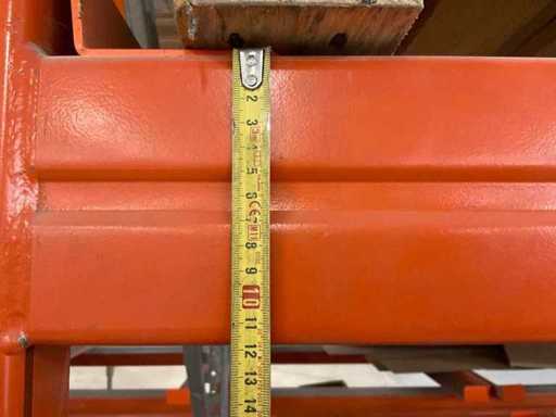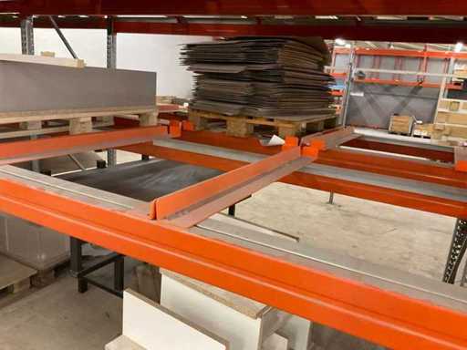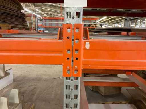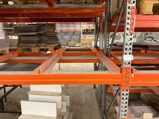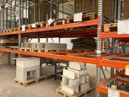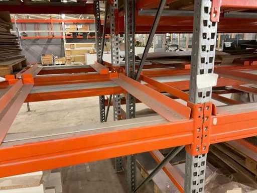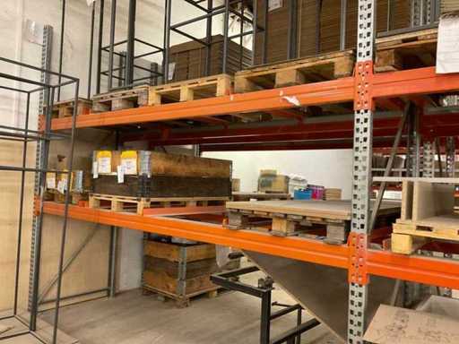 Heavy-duty shelf consisting of: 4 uprights approx. 1100x3300mm, 14 trusses approx. 3600mm, incl. pallet holders, with contents