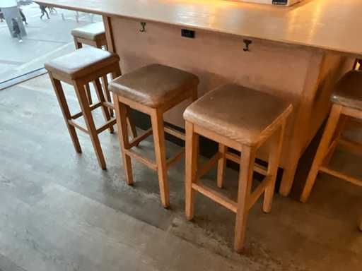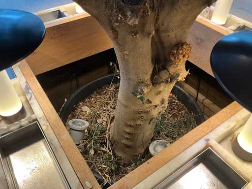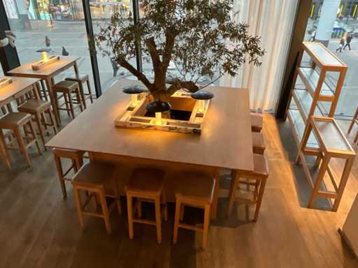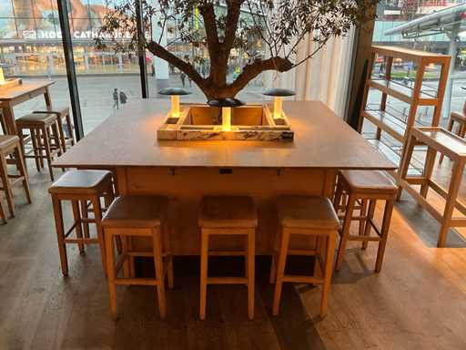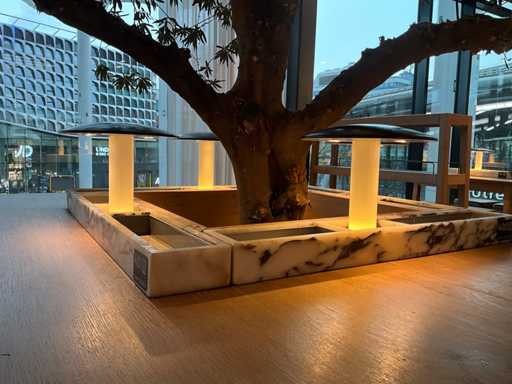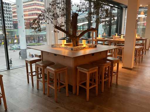 Bar table with marble superstructure with lighting, flower box with tree and 12 bar stools.