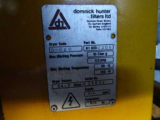 total hours: 2301, hours of draw: 1578, dimensions including trestle: 180x115x100cm (hxwxd) with Domnick Hunter Pneudri DM030 air dryer dimensions: 155x65x60cm (hxwxd)