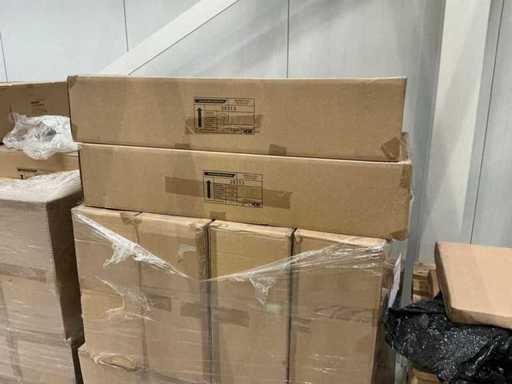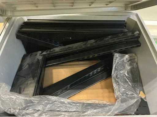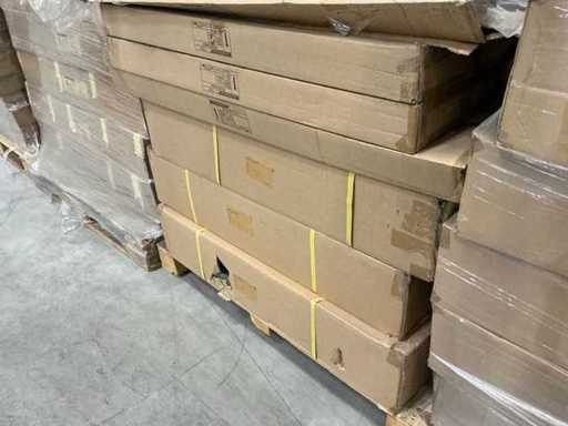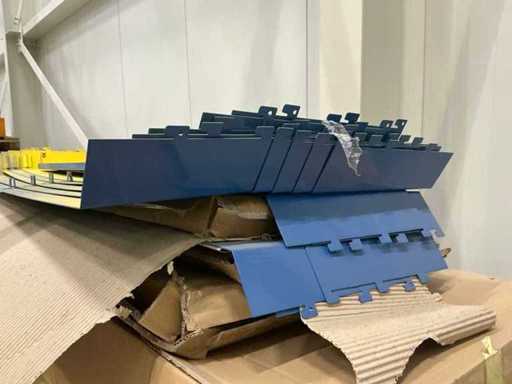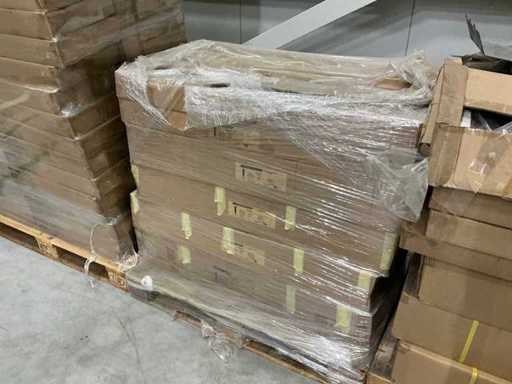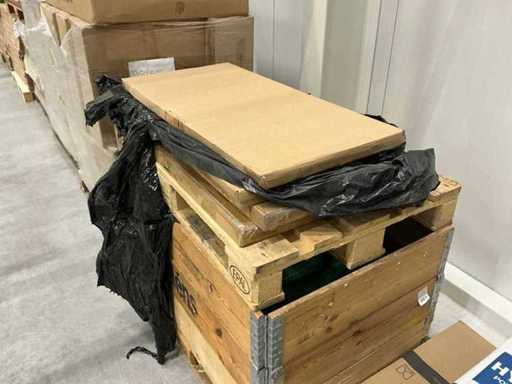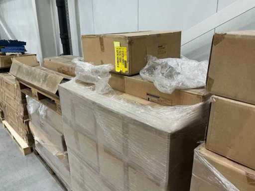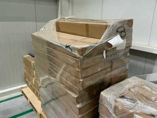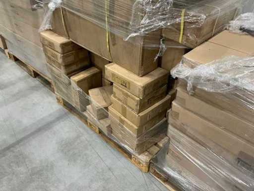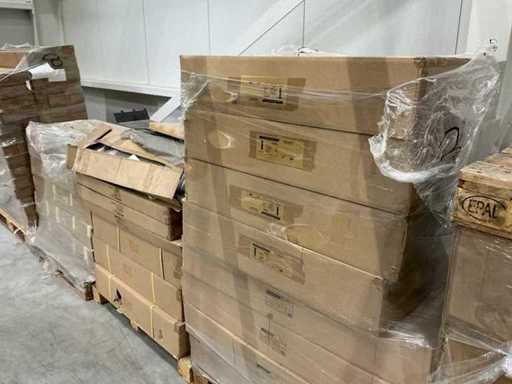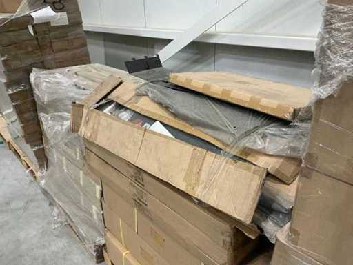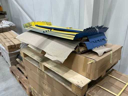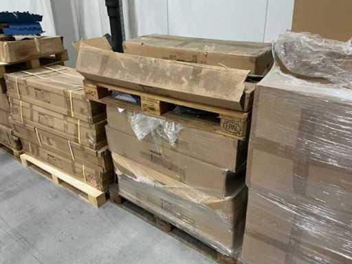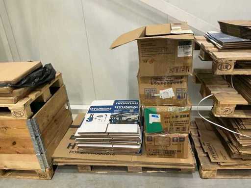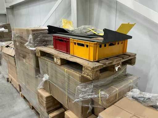 Batch of various promotional rack parts, walls, signs, packaging material, Kruizinga pallet boxes, etc. Everything on about 29 pallets