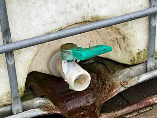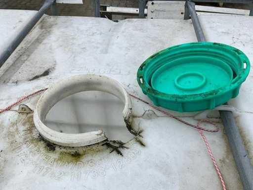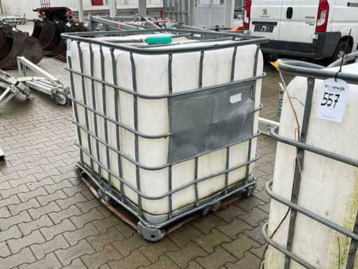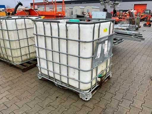 galvanized steel frame; plastic tub; capacity 1000 liters; mounted on plastic pallet; faucet; cap; damage to cap