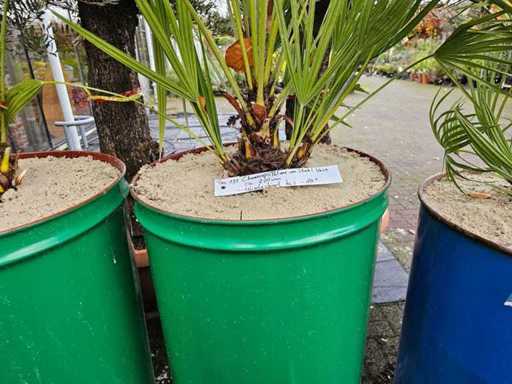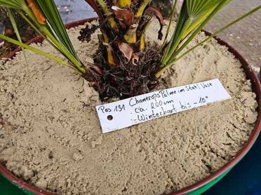 Bring Mediterranean flair to your outdoor area with this impressive Chamaerops humilis, also known as the European Fan Palm. Standing at a height of approx. 200 cm with its characteristic multi-stemmed growth, it is a true eye-catcher for any garden or terrace. The palm is planted in a robust, colorful steel vase in a modern upcycling style, finished with a decorative layer of light sand. This variety is particularly resilient and frost-hardy down to approx. -10°C, making it an ideal choice for outdoor spaces.