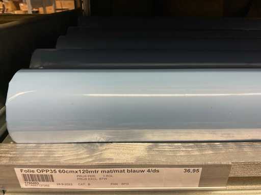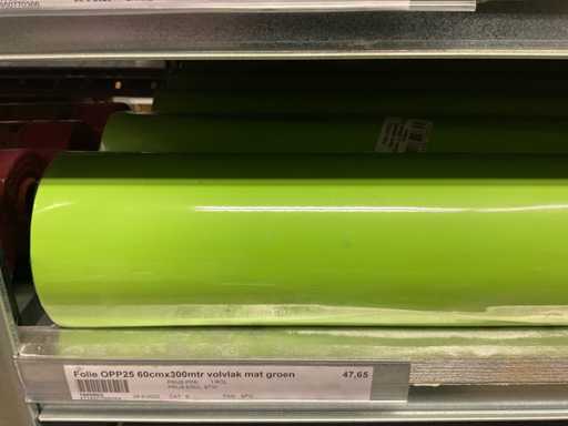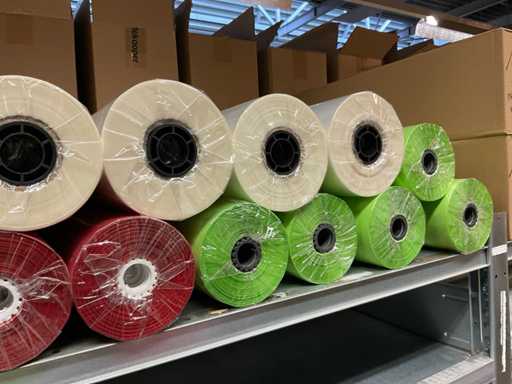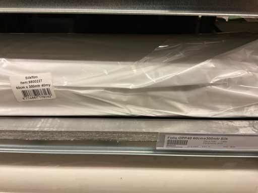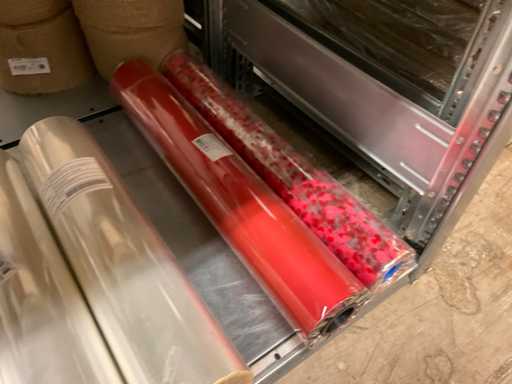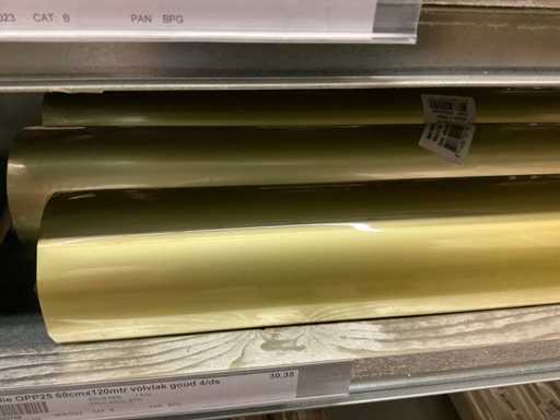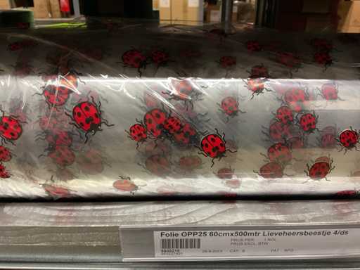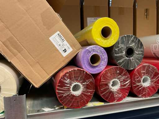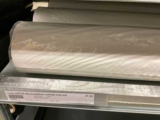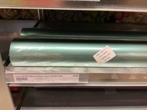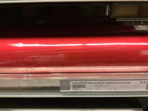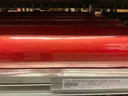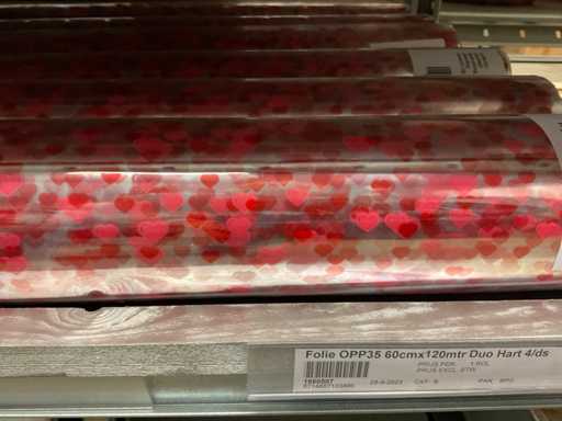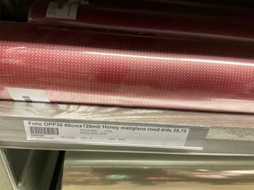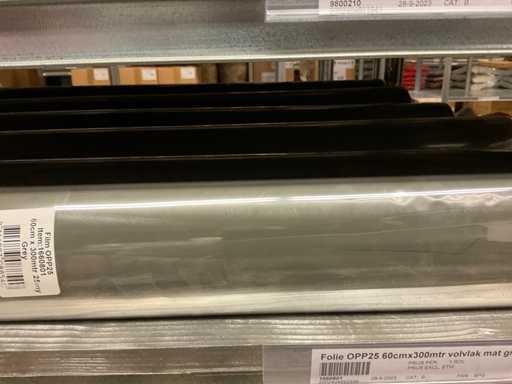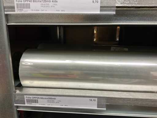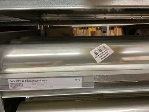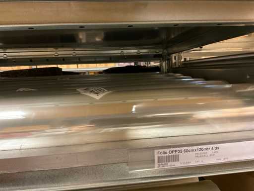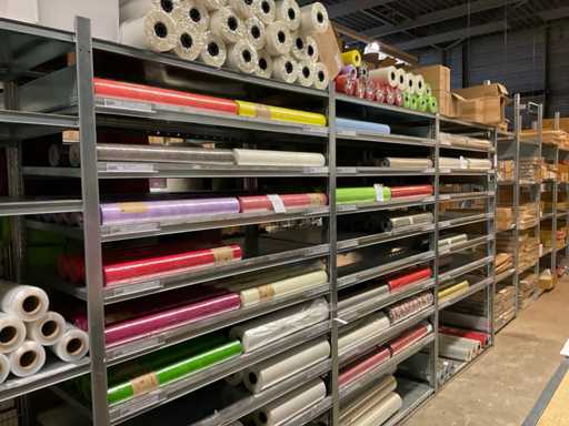 Film on roll, mainly OPP, various widths, lengths, colours and prints, all in 3 shelf sections next to each other.