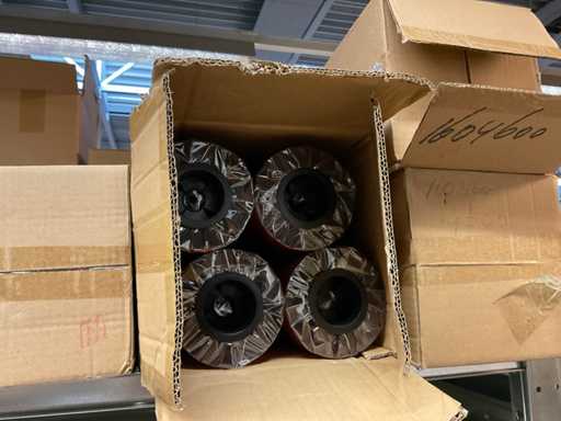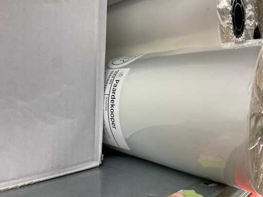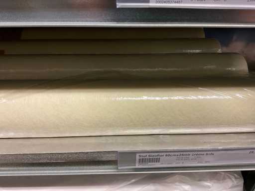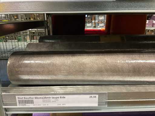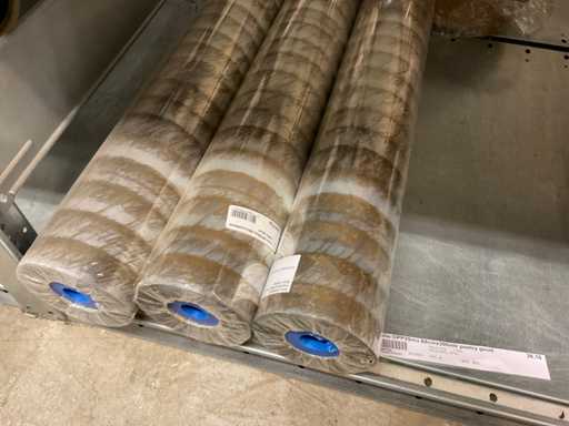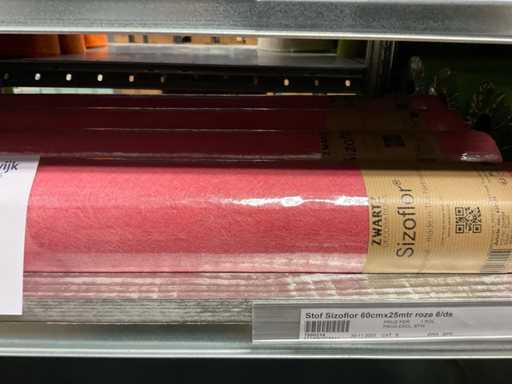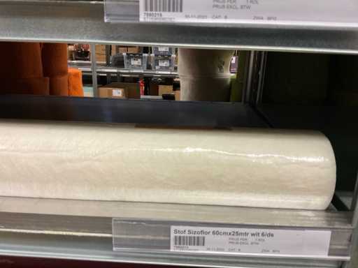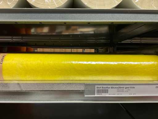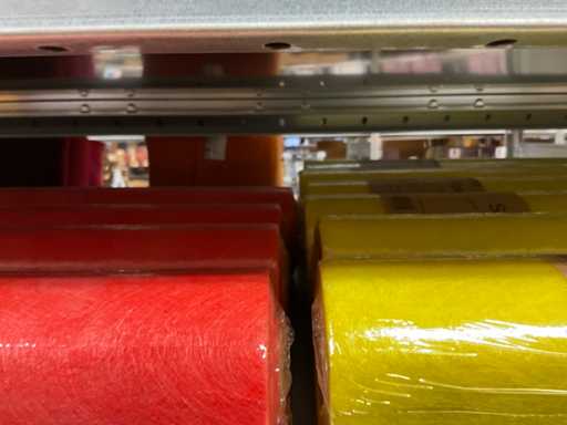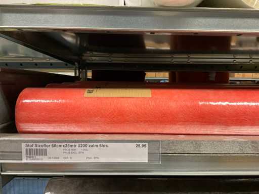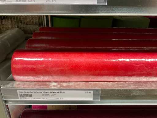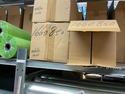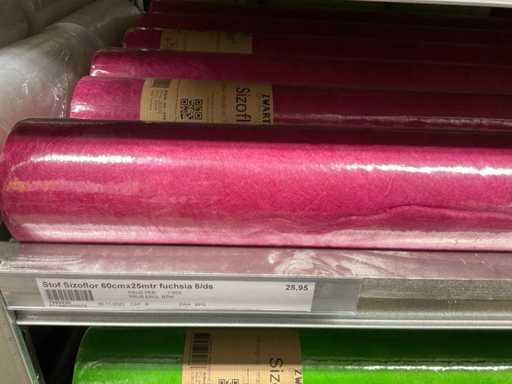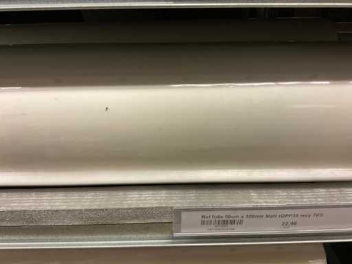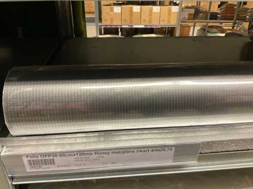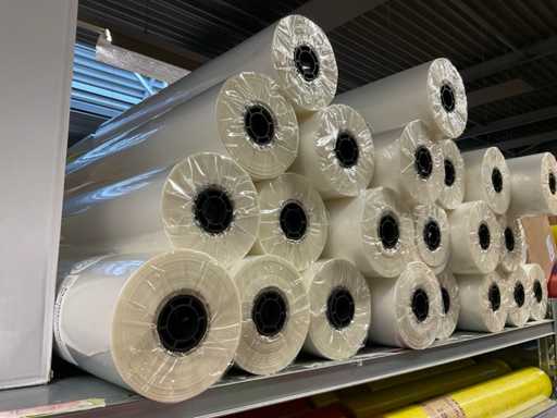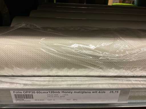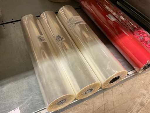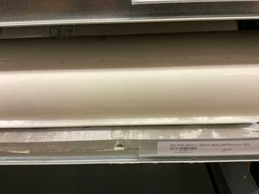 Film on roll, mainly OPP, various widths, lengths, colours and prints, all in 3 shelf sections next to each other.